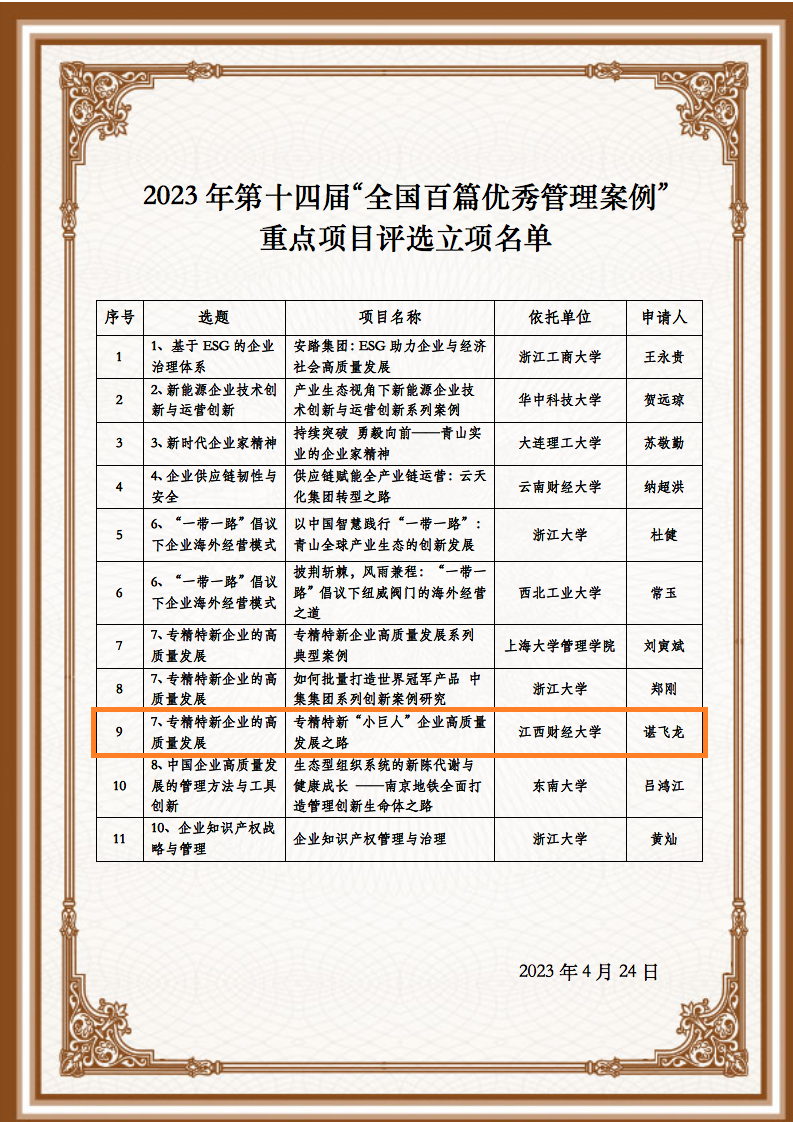 在全国工商管理专业学位研究生教育指导委员会支持和指导下,第十四届“全国百篇优秀管理案例”评选重点项目立项评审会议于4月21日在武汉召开。学院谌飞龙教授担任首席专家申请的《专精特新“小巨人”企业高质量发展之路》获批立项,实现我校在该类案例项目零的突破。