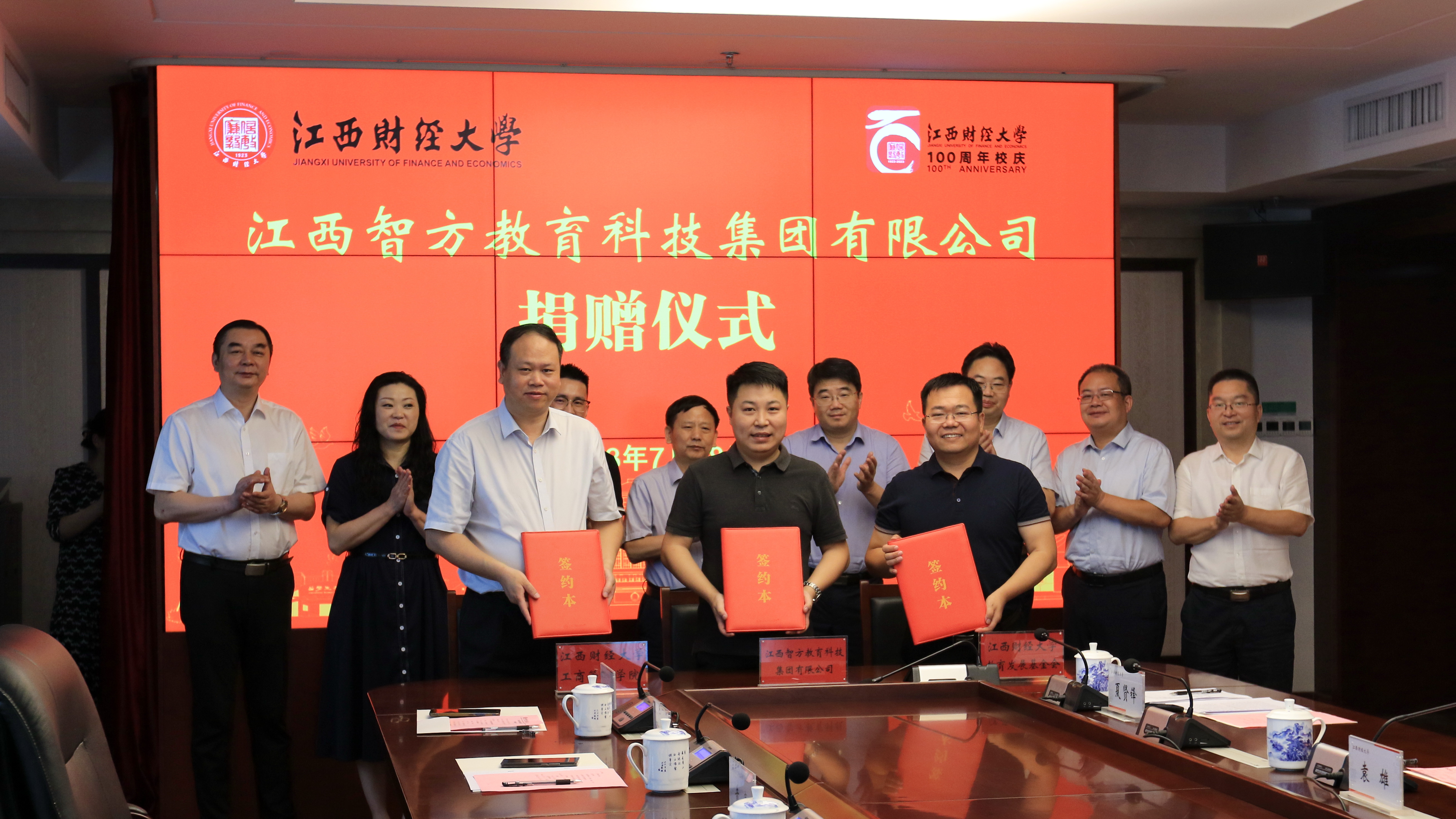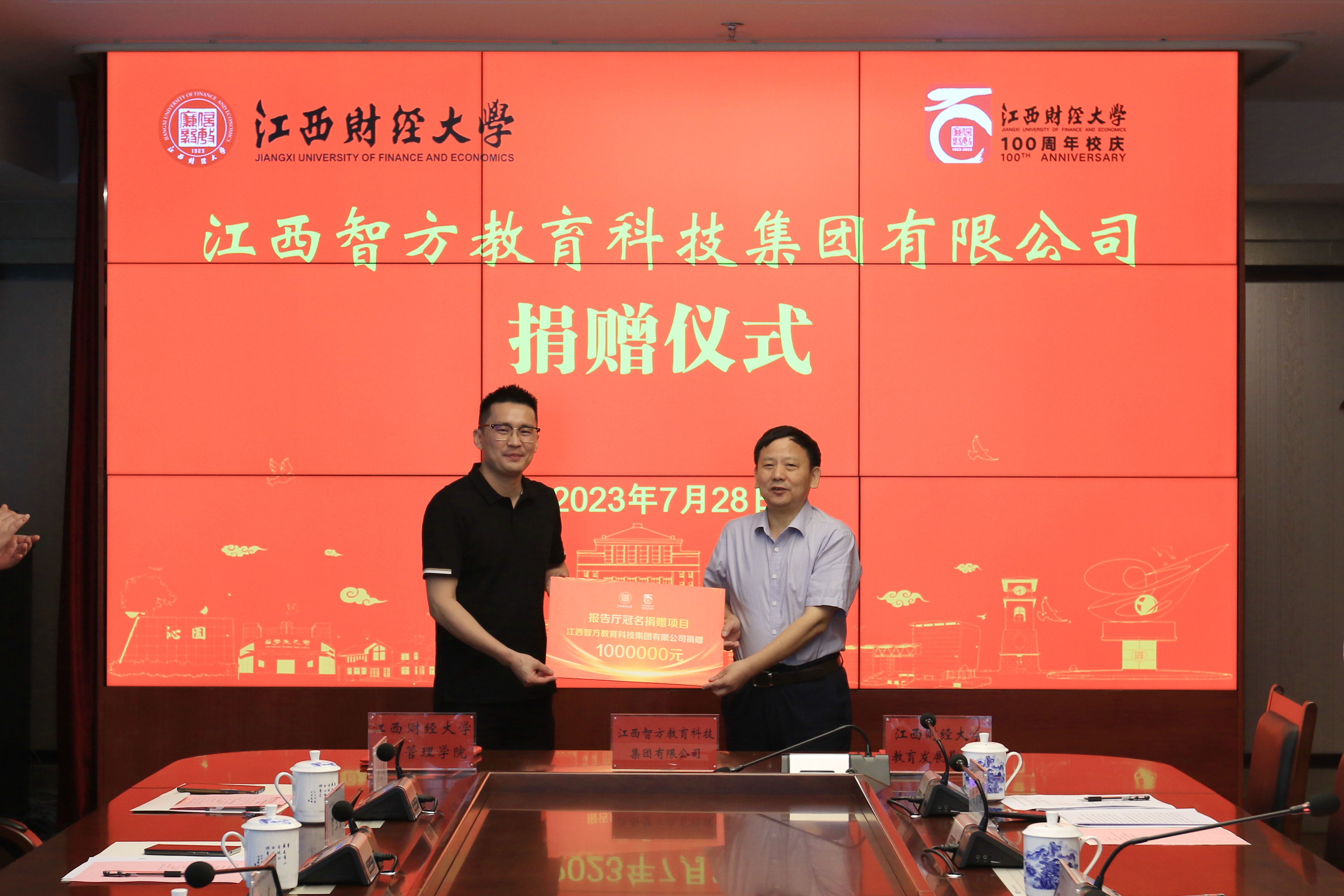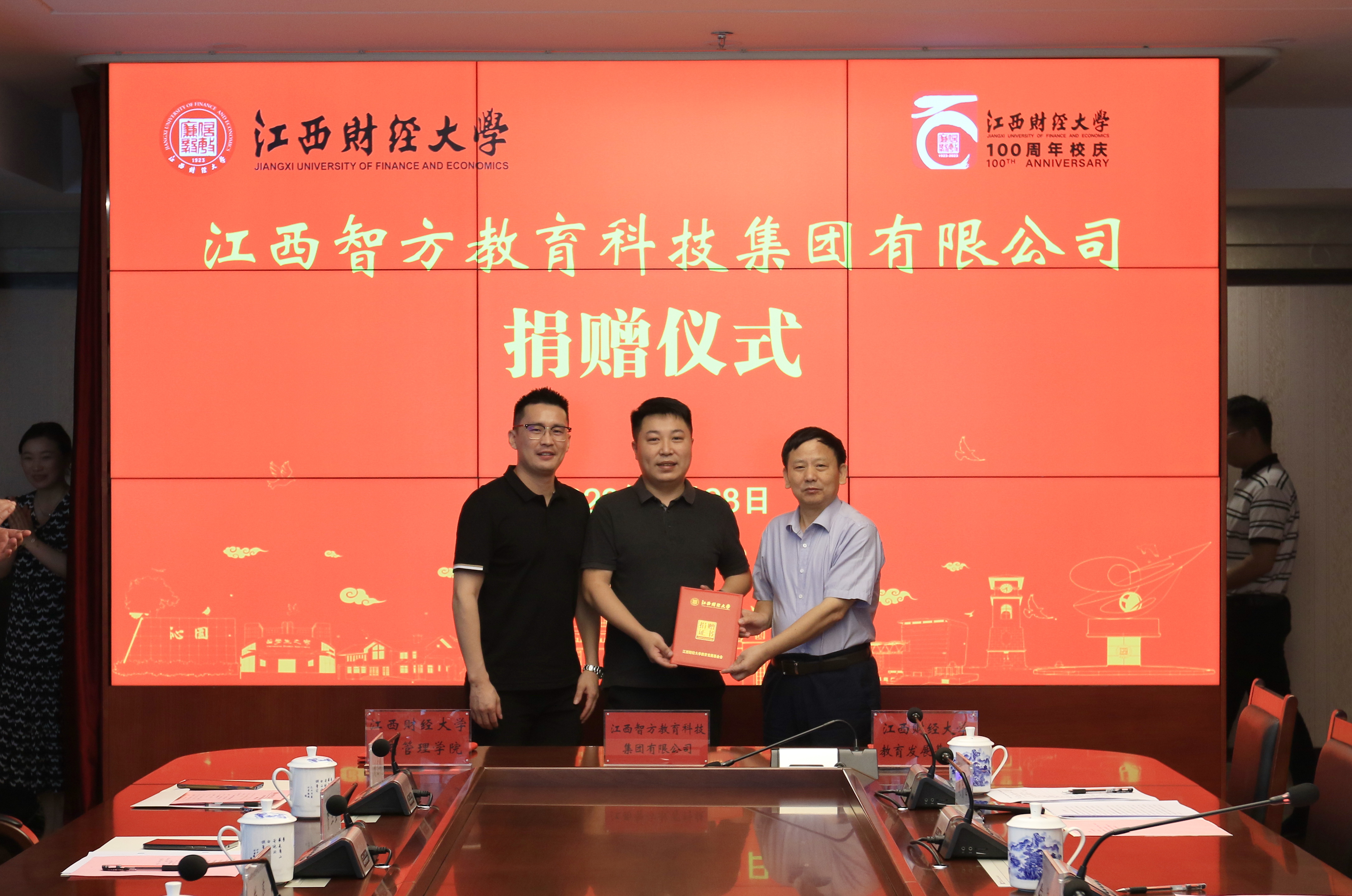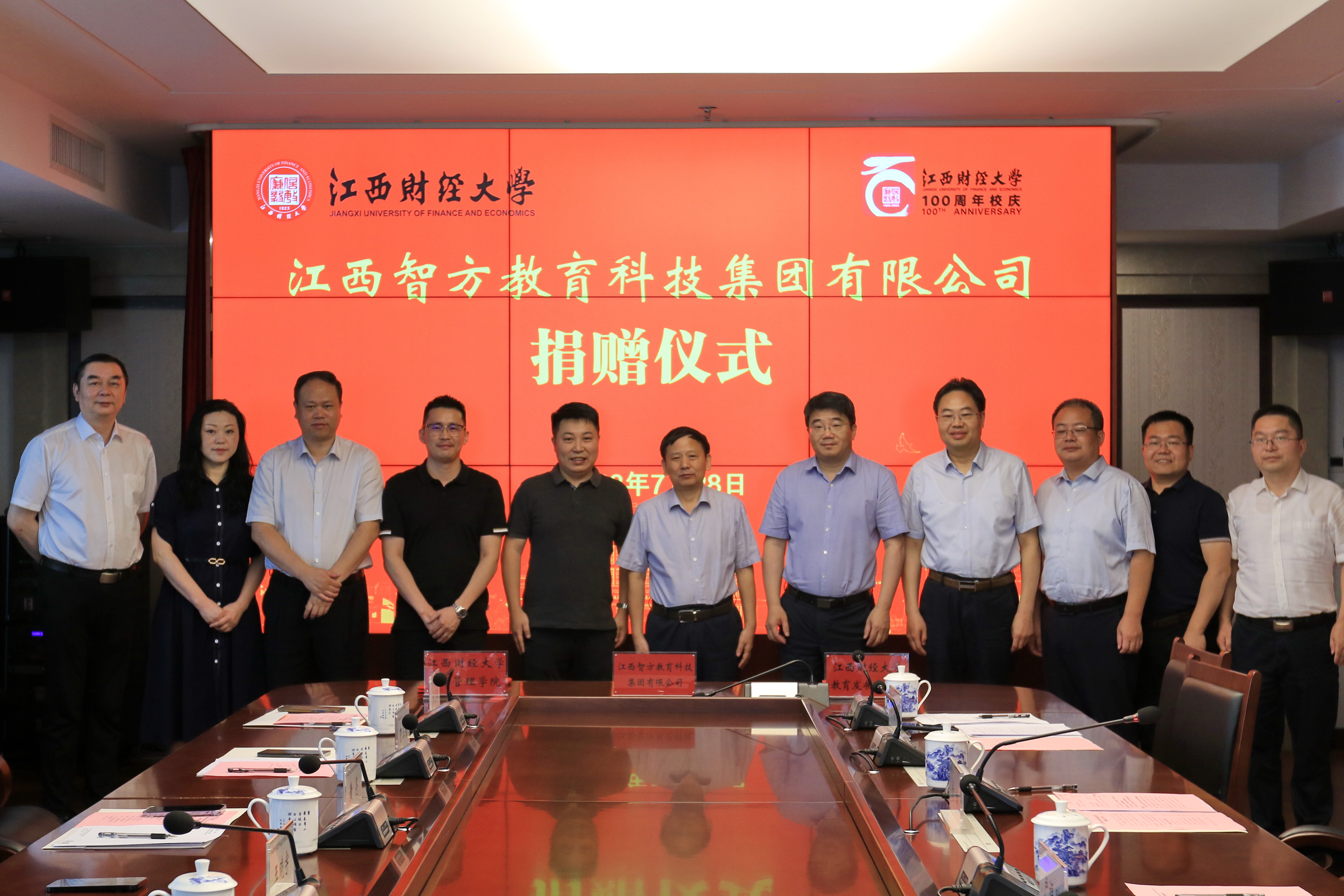 7月28日上午,江西智方教育科技集团有限公司捐赠仪式在蛟桥校区图文信息大楼12楼第1会议室举行。校党委书记卢福财、校长邓辉,2020级MBA校友、江西智方教育科技集团有限公司董事长王晓宇、总经理黄亮出席捐赠仪式。副校长袁雄主持仪式。