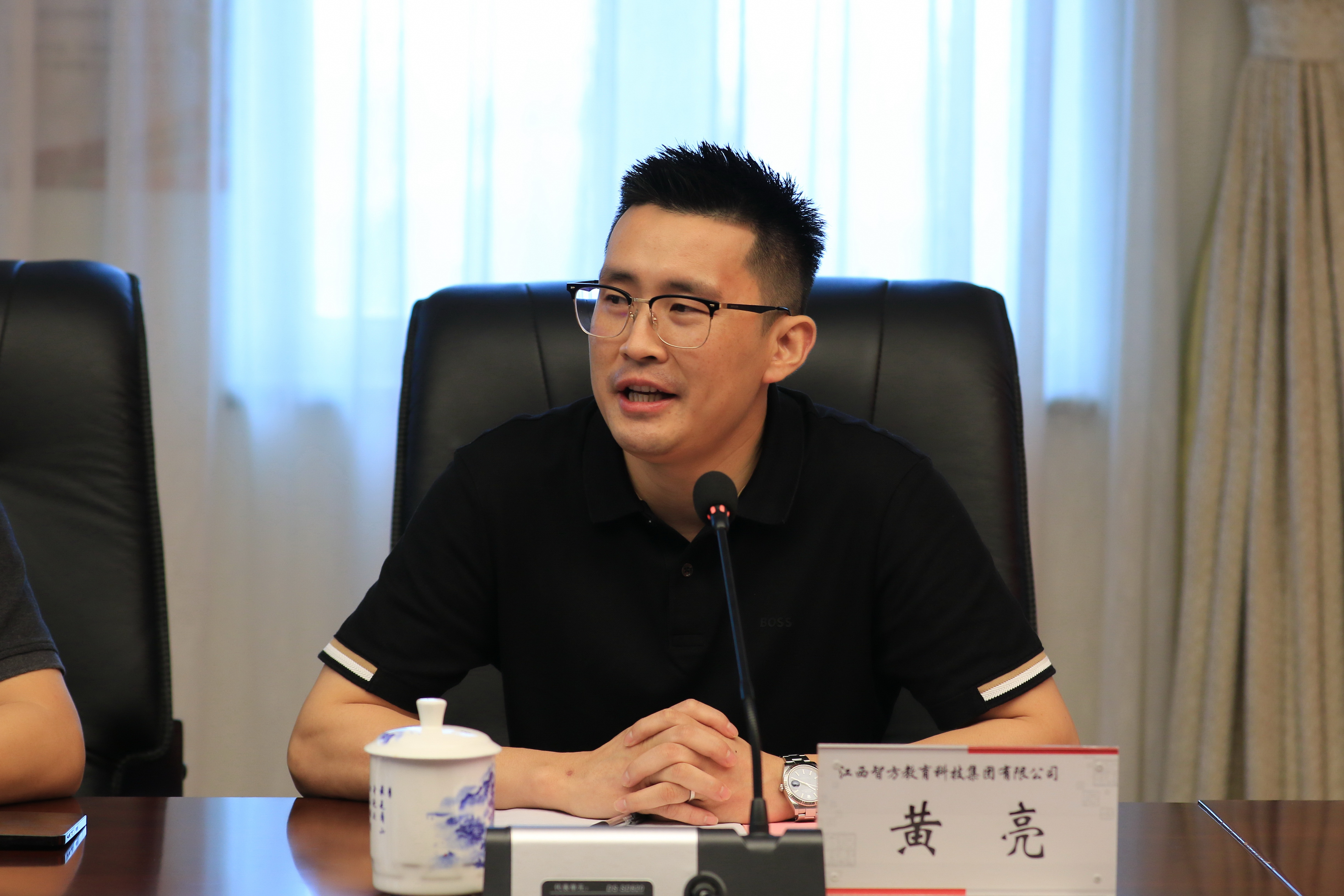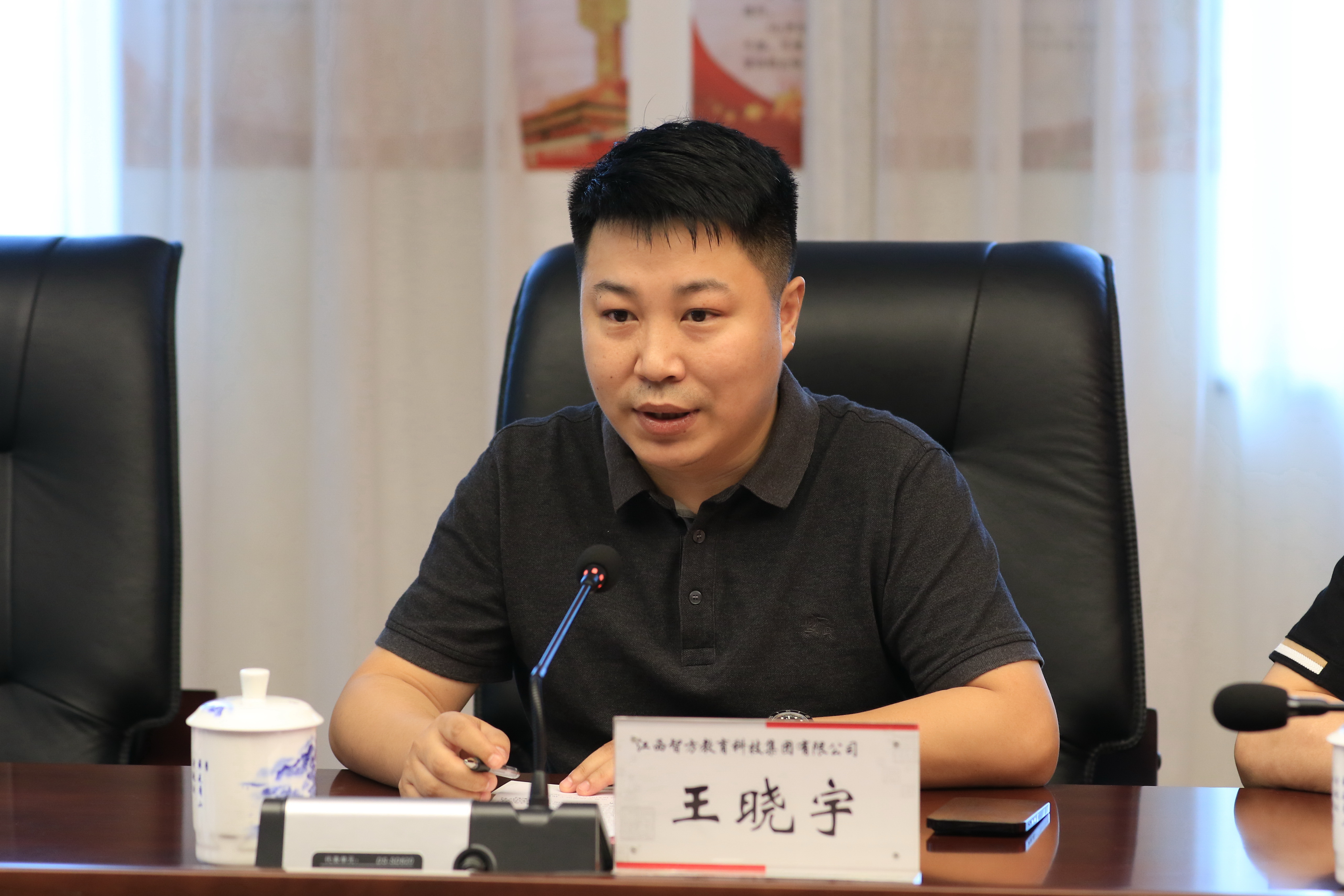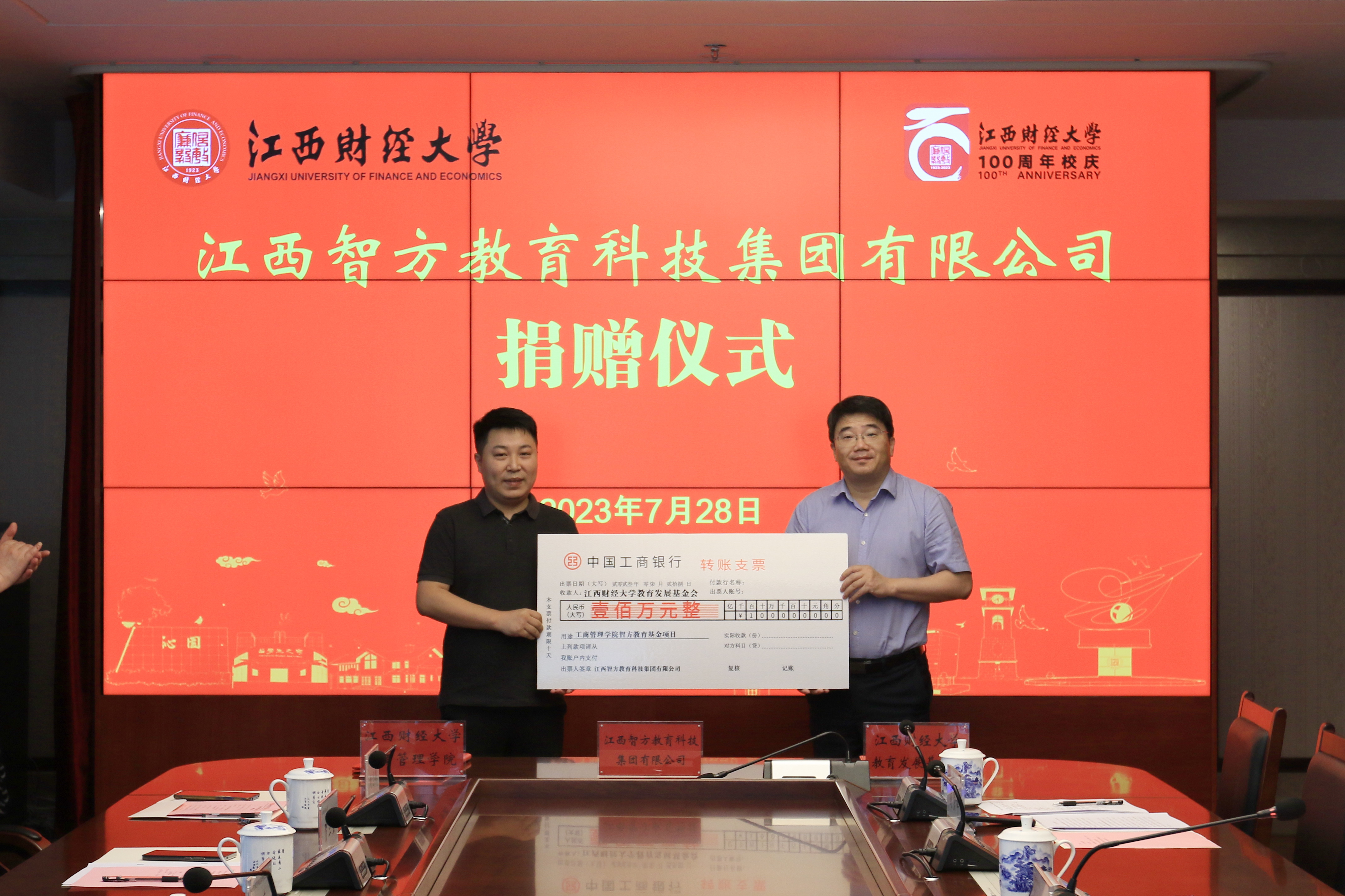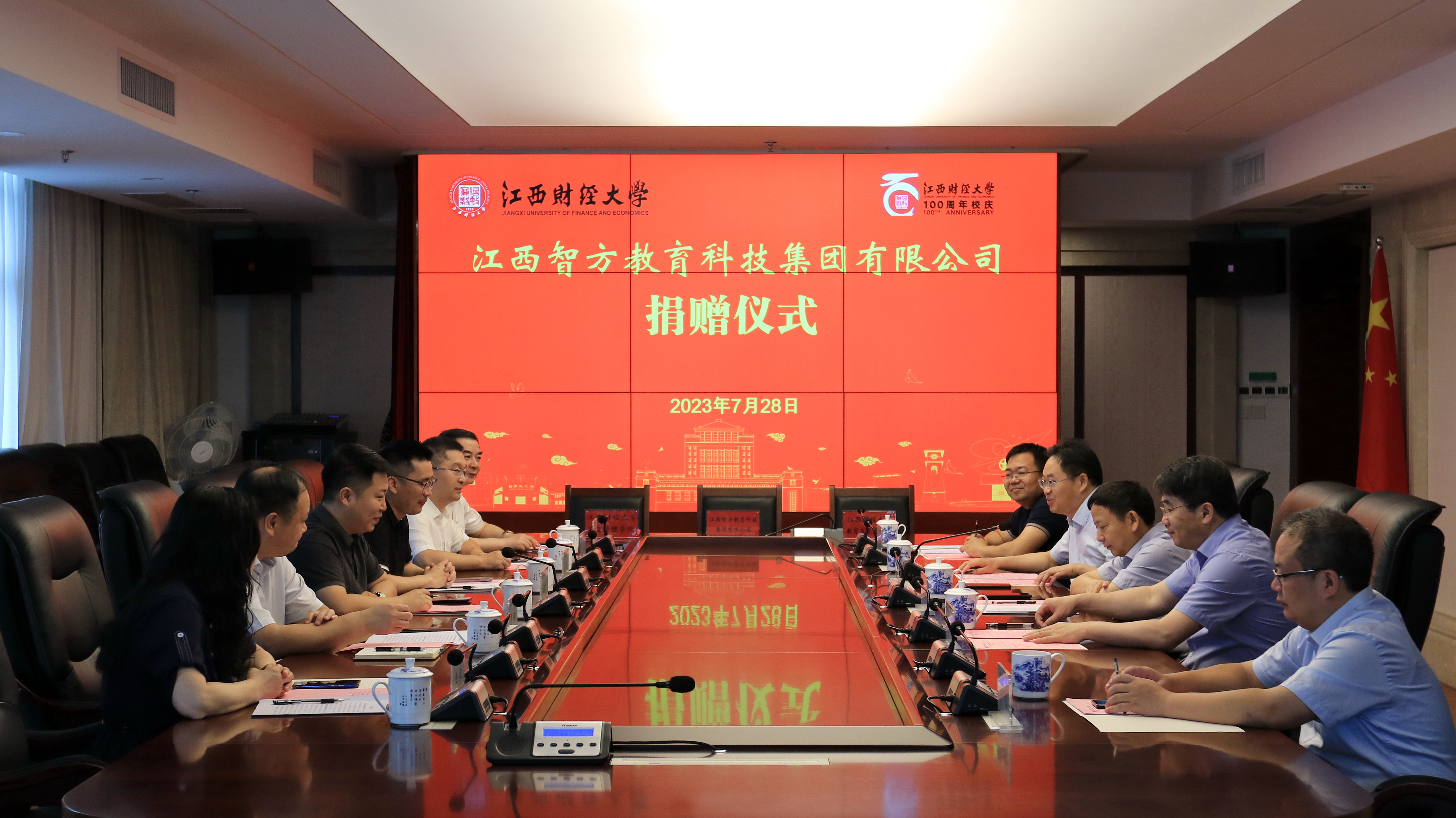 7月28日上午,江西智方教育科技集团有限公司捐赠仪式在蛟桥校区图文信息大楼12楼第1会议室举行。校党委书记卢福财、校长邓辉,2020级MBA校友、江西智方教育科技集团有限公司董事长王晓宇、总经理黄亮出席捐赠仪式。副校长袁雄主持仪式。