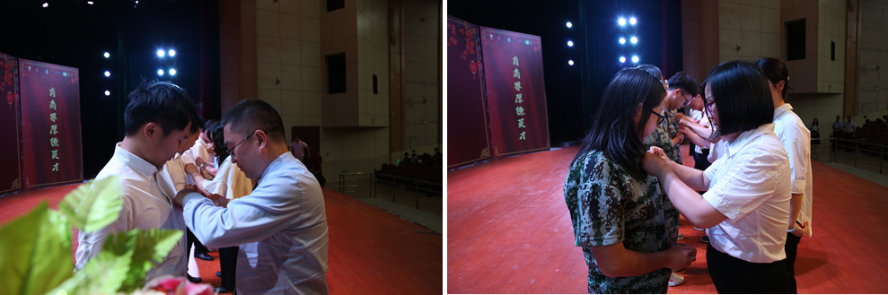 典礼上,学院教师代表为新生代表们佩戴校徽。