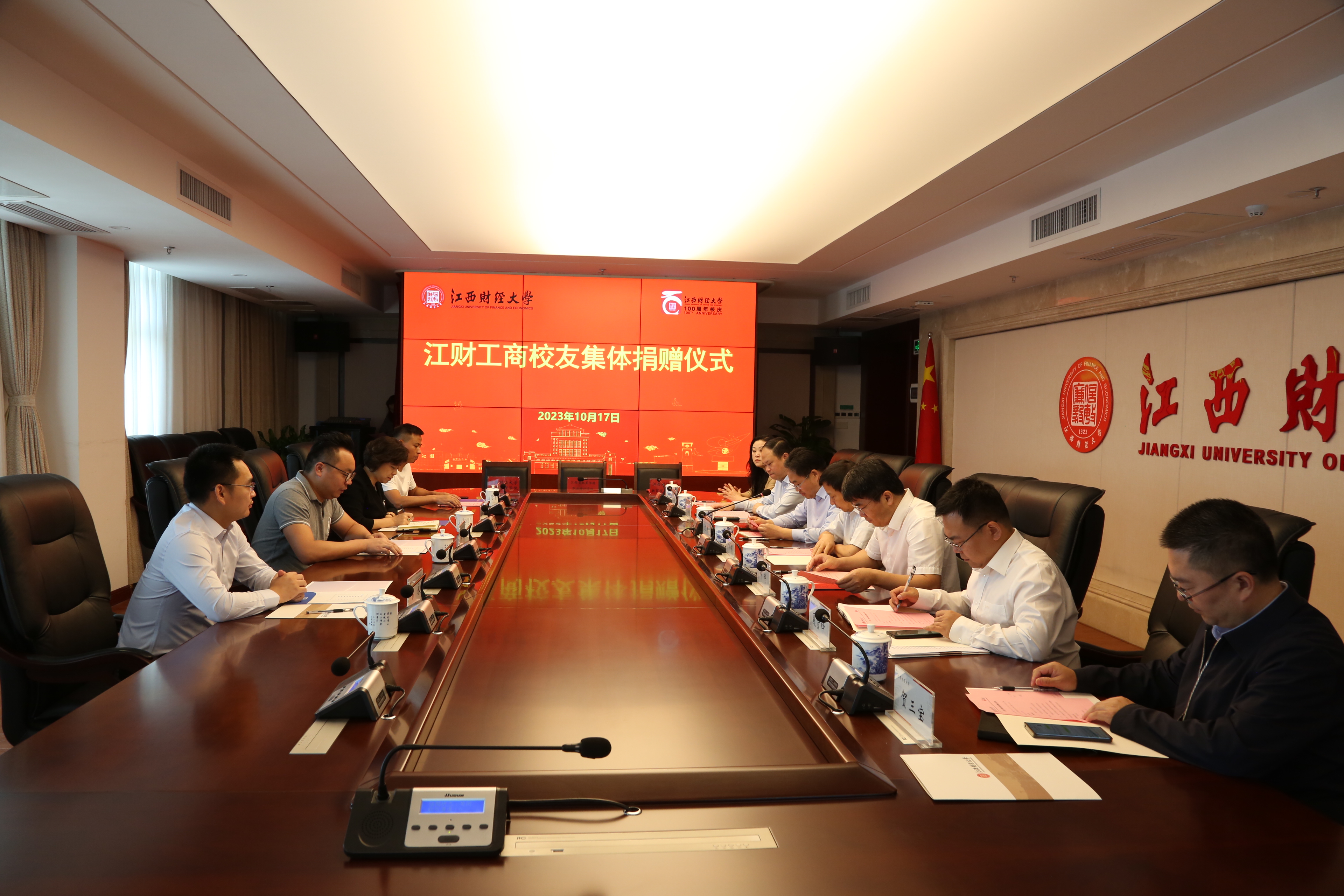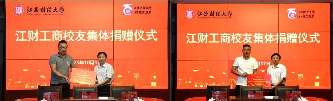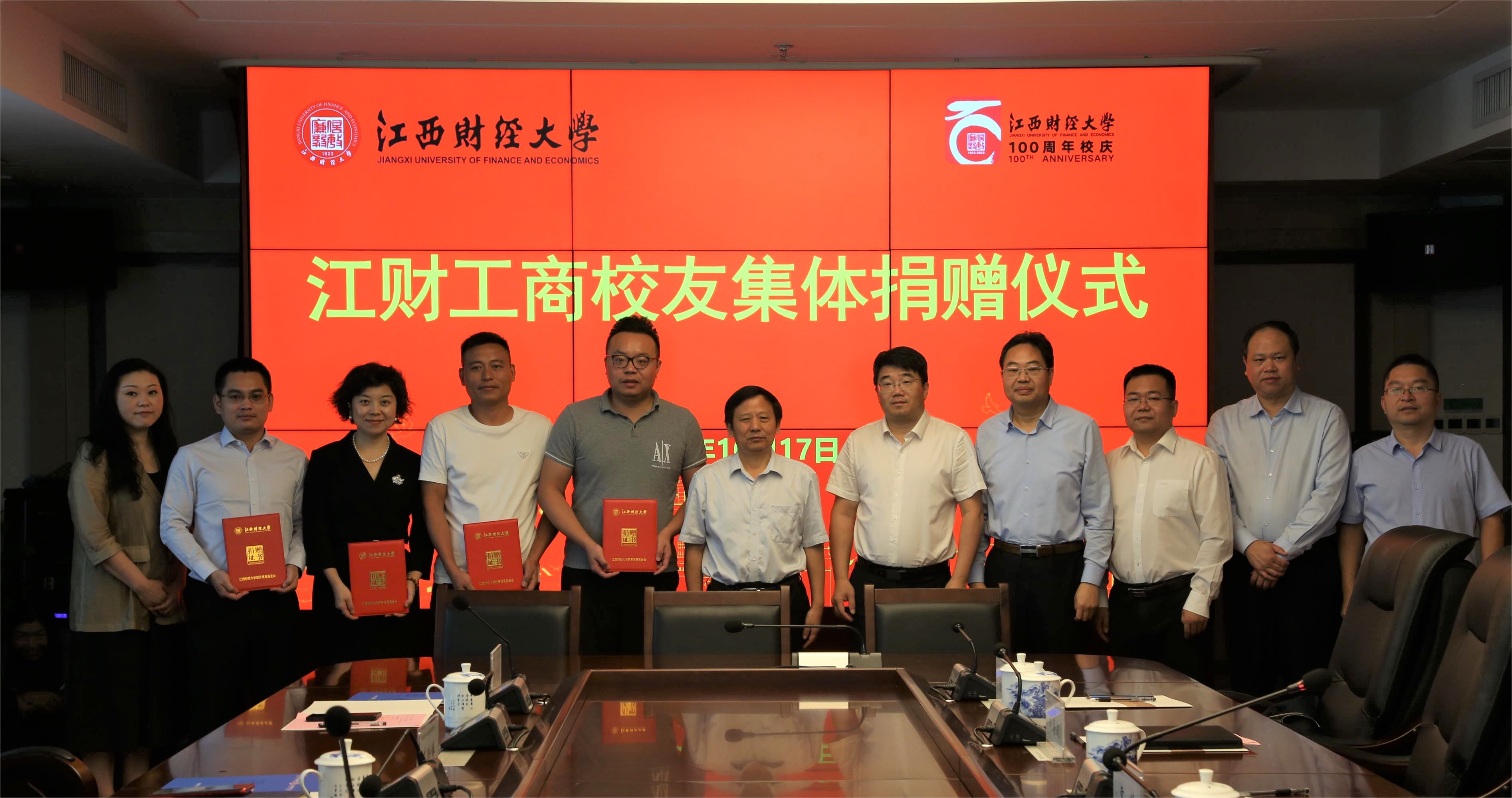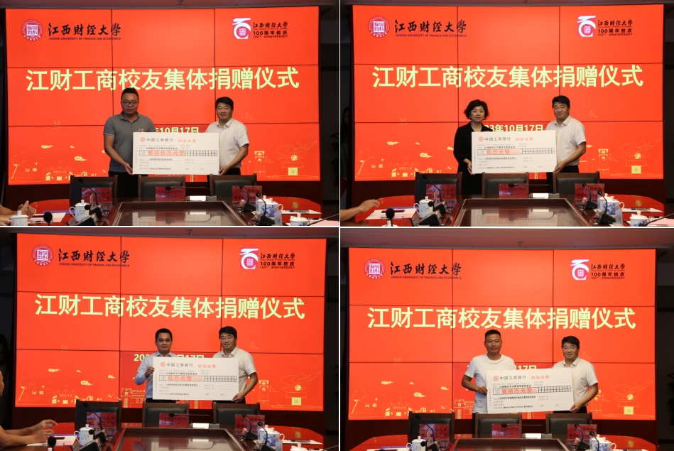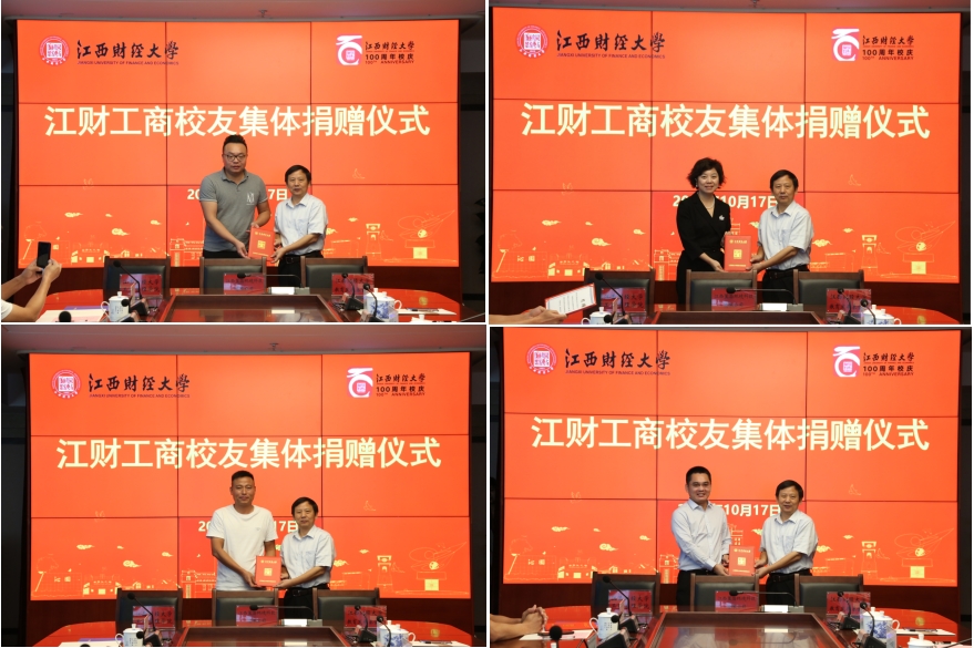10月17日上午,工商管理学院校友集体捐赠仪式在蛟桥校区图文信息大楼12楼第一会议室举行。江西财经大学党委书记卢福财,校长邓辉,2008级物流管理专业校友、江西省红星传媒职业培训学校总经理李云,2009级秋季MBA校友、MBA校友会执行会长、博海国济(江西)教育咨询有限公司创始人齐玲博,EDP赣州24班、赣州市江西财经大学EMBA同学联谊会常务副会长、江西瑞瀚建设有限公司戈永发,赣州市江西财经大学EMBA同学联谊会党支部书记易永等出席捐赠仪式。校党委常委、副校长袁雄主持仪式。