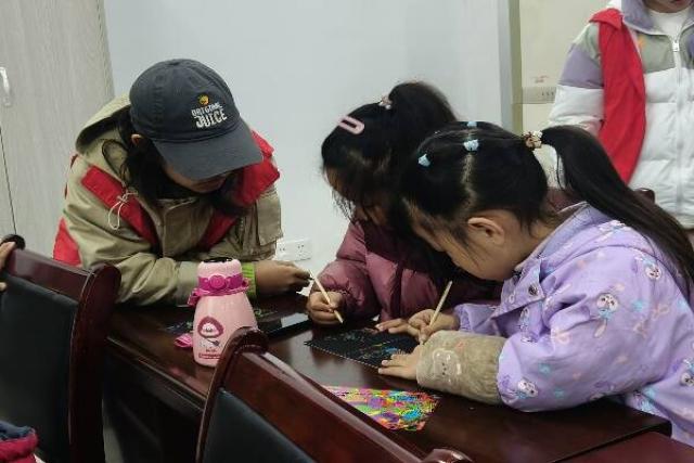 接着进行兴趣课堂教学,志愿者先带领小朋友们了解刮画的定义,小朋友们积极举手回答问题,全神贯注地投入课堂教学中。接着,志愿者向小朋友们展示如何刮画,并鼓励小朋友们仔细观察,亲手操作。小朋友们认真学习,在纸上绘制出“公鸡”、“长颈鹿”等图案。随后,志愿者带领小朋友们进行主题绘画创作,并介绍“天安门下的五星红旗”这一作品蕴含的深意,带动小朋友们发挥自己的想象进行创作。最后,志愿者组织小朋友们合作完成作品。完成作品后,小朋友们向志愿者展示自己的画作,并与志愿者合影留念。