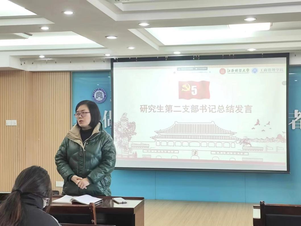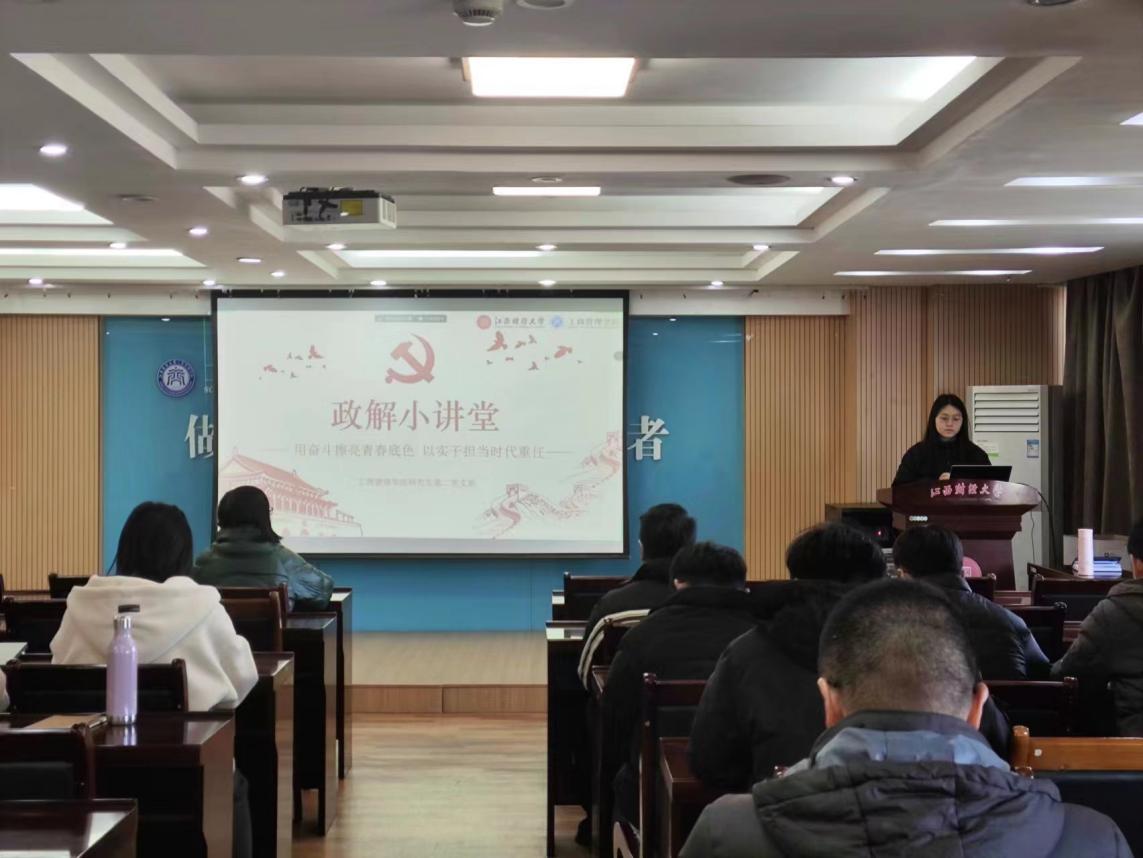为进一步深入理解习近平新时代中国特色社会主义思想的理论创新与时代价值,着力把握精髓要义,加强思想引领,12月22日工商管理学院研究生第二党支部在工商大楼416会议室举办了以“用奋斗擦亮青春底色 以实干担当时代重任”为主题的支部特色活动——政解小讲堂。