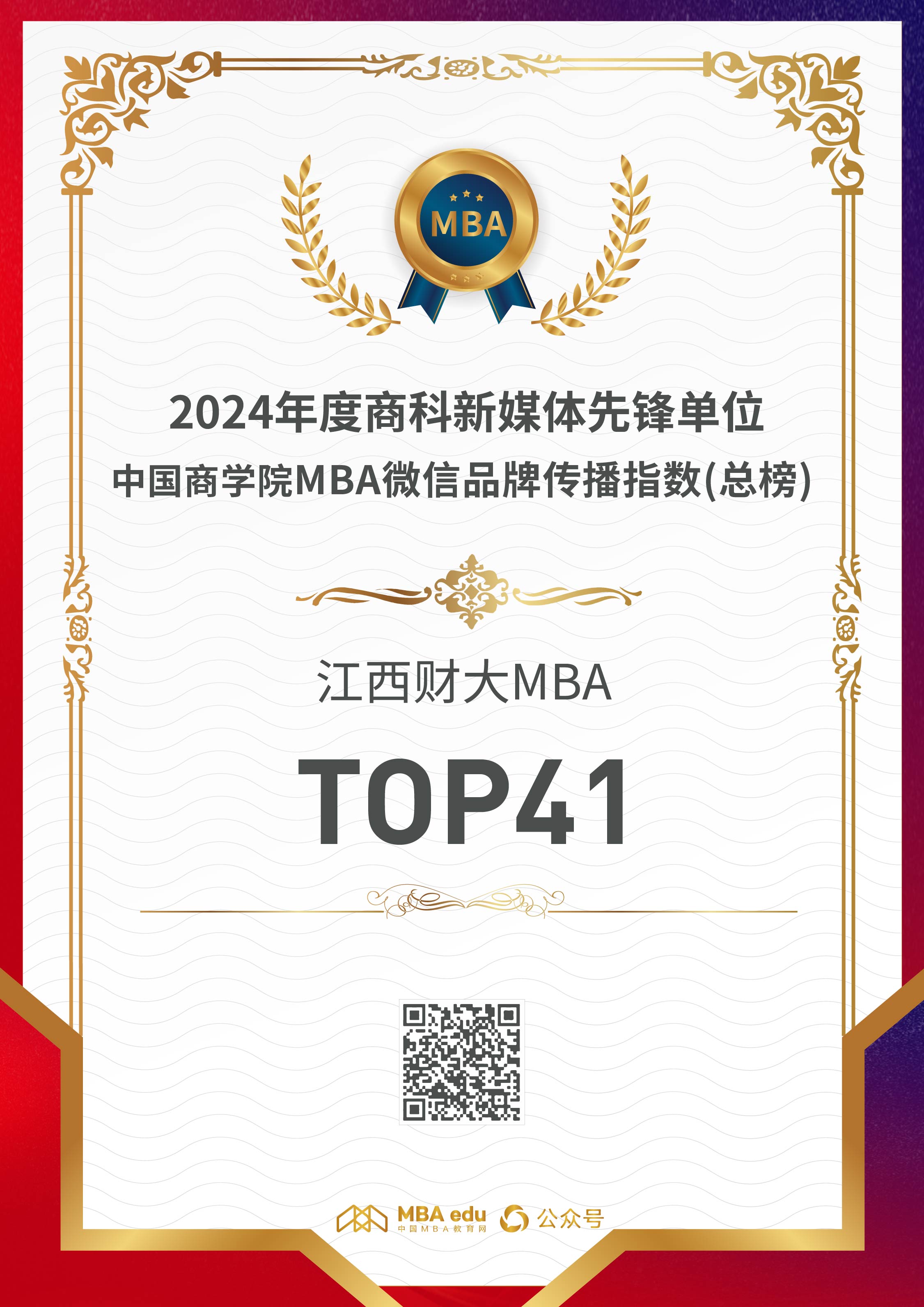 本次庆典上“江西财大MBA”公众号在国内200余所商学院的MBA官方微信公众号中脱颖而出,进入“2024年度中国商学院MBA微信品牌传播指数TOP100”榜单前50,位列41名。