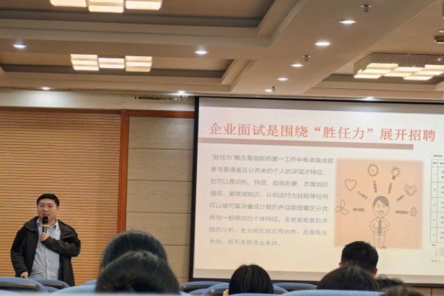 紧接着,张天元对面试技巧进行详细的讲解。他首先提到一些常用的面试技巧,并结合企业HR特别关注的问题进行实例分析。此外,张天元还对面试的两种类型——个体面试和群体面试做出介绍,并提醒同学们在面试过程中需要注意的礼仪和细节问题。各位同学也积极发言,就面试环节的疑惑进行询问。
