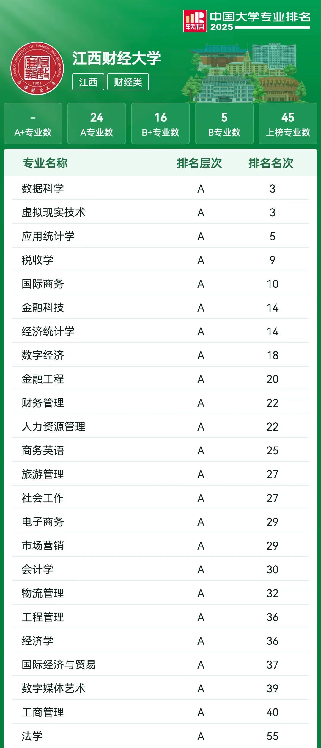 近日,上海软科教育信息咨询有限公司(简称软科)公布了2025年中国大学专业排名,工商管理学院五个本科专业均获A级评价。这是自2021年软科首次推出中国大学专业排名以来,学院本科专业连续第五年获得全A级评价。同时也是学校各学院中,获得A级评价专业最多的学院。