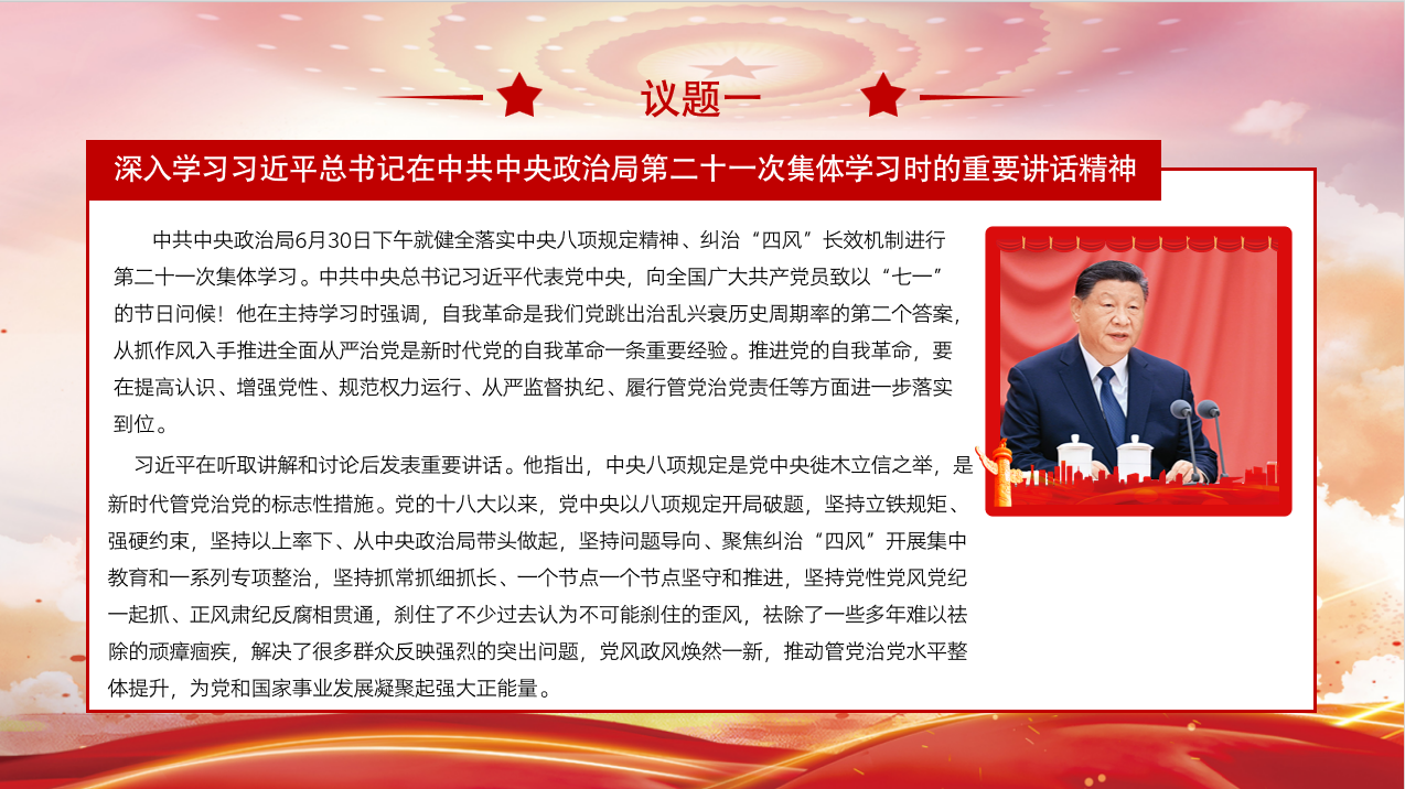 活动伊始,学生党员陈枫同志带领大家落实开展第一议题的学习,深入学习习近平总书记在中共中央政治局第二十一次集体学习时的重要讲话精神。习近平指出,中央八项规定是党中央徙木立信之举,是新时代管党治党的标志性措施。他强调,我们党肩负的中国式现代化建设任务十分繁重,面临的执政环境异常复杂,自我革命这根弦必须绷得更紧。党组织和党员无论处在哪个层级、担负什么工作,都应该有自我革命的责任。领导干部首先是高级干部更要在自我革命上以身作则。