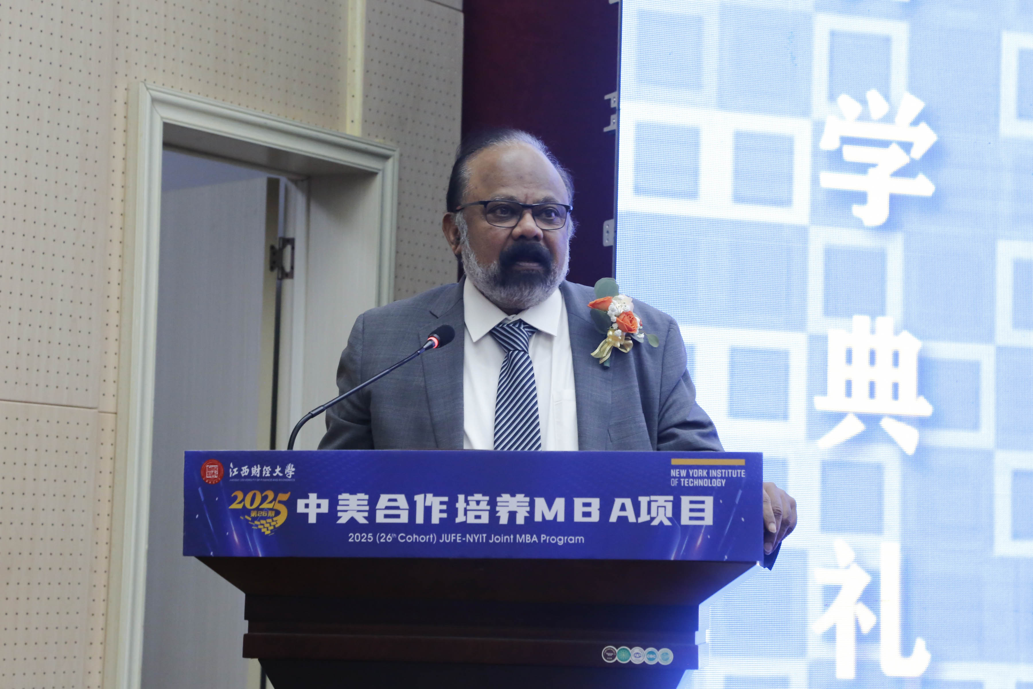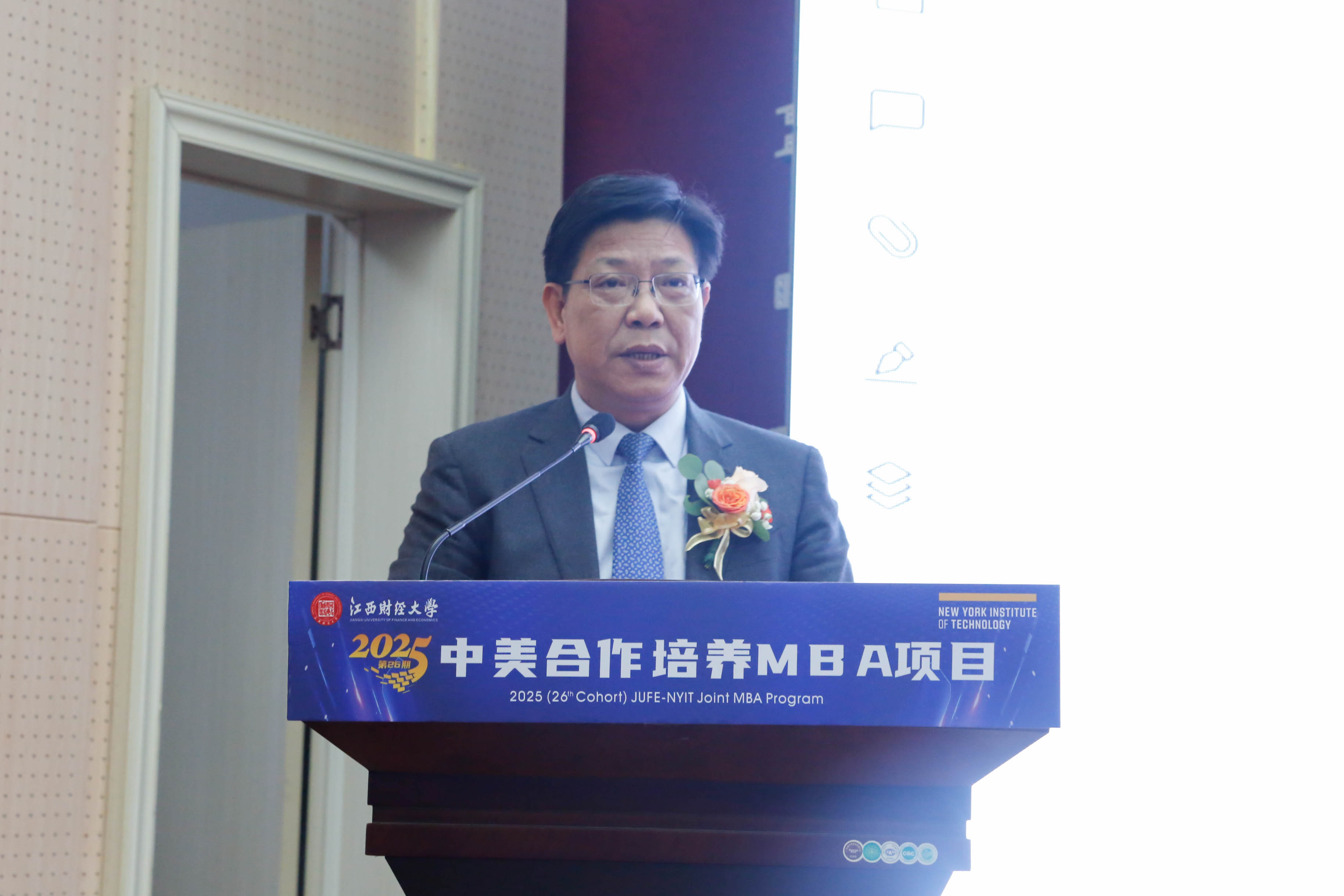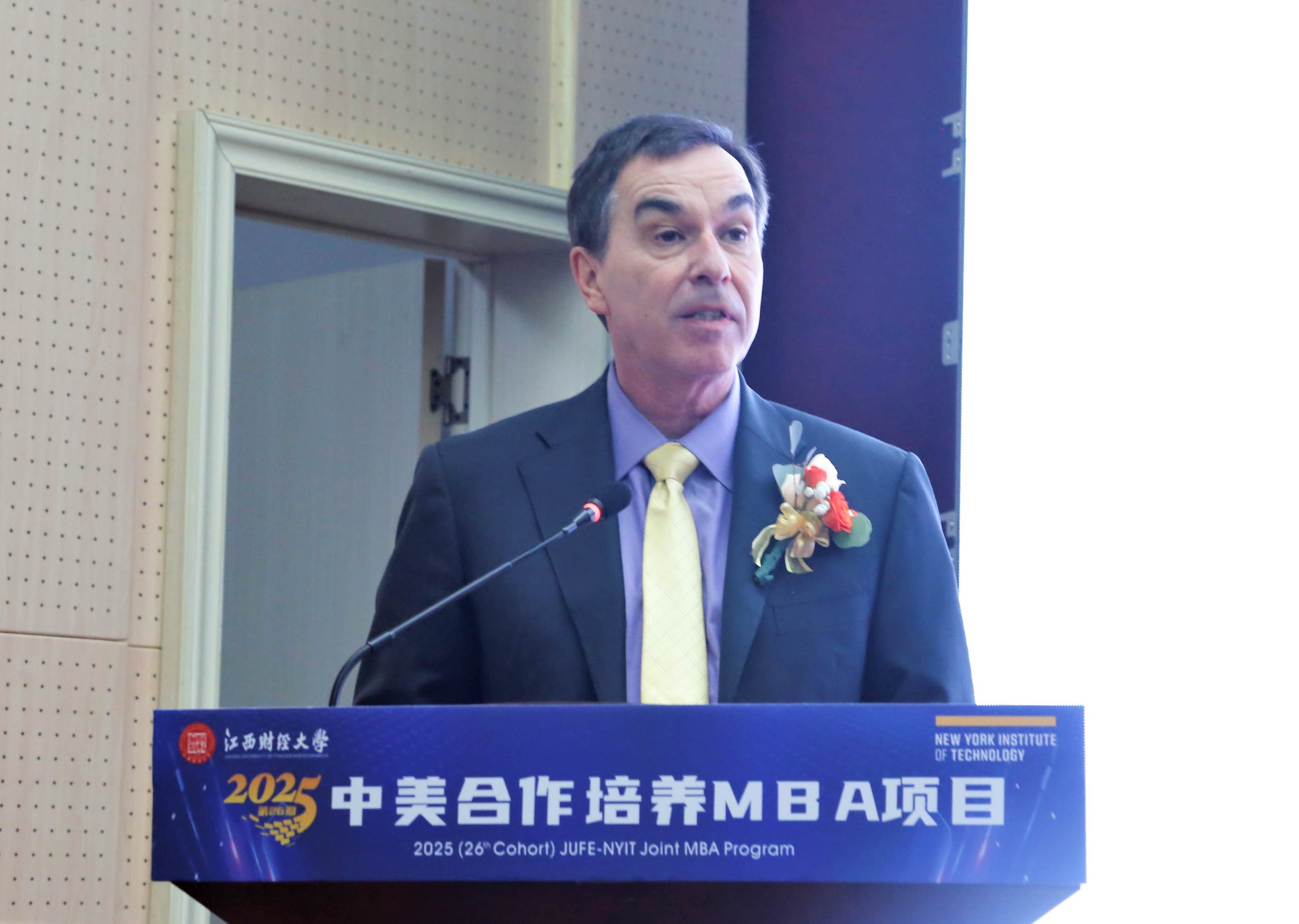 杰瑞·巴伦丁在致辞中回顾了美国纽约理工学院和江西财经大学合作举办MBA项目27年的发展历史,并对江西财经大学的持续支持以及相关领导老师的辛勤付出表示感谢。杰瑞·巴伦丁校长表示中美两校双方秉持共同目标、追求卓越的合作理念,让这段关系不仅是简单的合作,更是深厚稳固的战略伙伴关系——它惠及每一位学生、两所高校,也为我们中美两个伟大的国家搭建了友谊与交流的桥梁。基于美国纽约理工学院的使命与愿景,他鼓励2025级新生把握好每一个机会,积极投身社会,心怀人文关怀精神,与同窗好友建立人脉、切磋学习、携手合作——这里的同窗不仅包括中国同胞,还有来自美国及全球其他国家地区的学子。