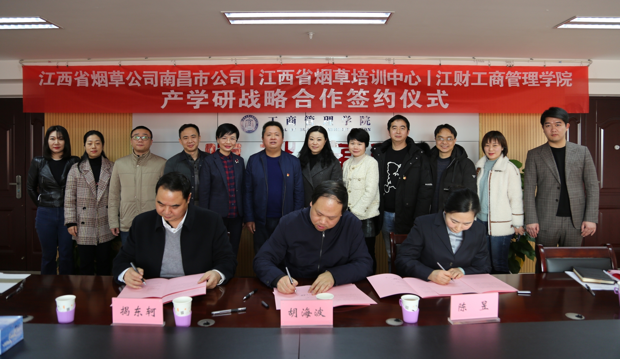 1月19日下午,工商管理学院与江西省烟草公司南昌市公司、江西省烟草培训中心三方合作协议签约仪式在麦庐校区英孚楼503会议室举行,江西省烟草公司南昌市公司党组书记、局长、经理揭东轲,党组成员、副经理余鸿莺,江西省烟草培训中心主任陈昱,工商管理学院院长胡海波,党委书记黄文德及院领导班子成员出席签约仪式。黄文德主持签约仪式。