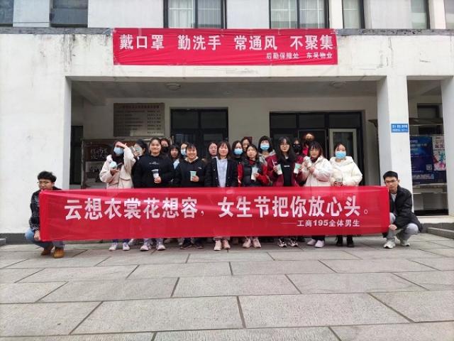 “云想衣裳花想容,女生节把你放心头。”“202全体男生祝所有女生女生节快乐!”3月7日上午,诸如此类的口号声在女生宿舍楼下不胜枚举,那是工商管理学院的男孩子们在感谢女生带给他们的欢声笑语,他们还准备了糖果、奶茶等礼品以博佳人一笑。