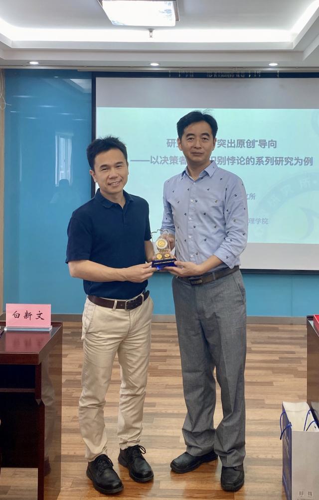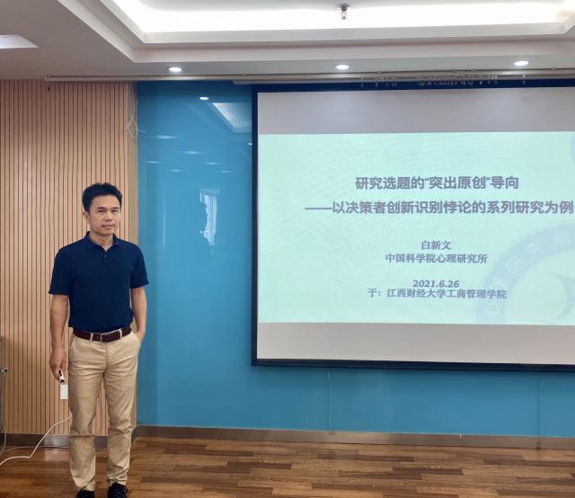 上午,白新文博士以 “研究选题的突出原创导向”为题,以决策者创新识别悖论的系列研究为例来阐释研究选题的“突出原创”导向。白新文将生活中“庄稼别家好,孩子自家亲”的悖论现象引申至创新识别领域,以剖析人机互动在评估客体子系统、评估主体子系统与环境子系统间的互动,提出“创新识别悖论”概念,并从决策者信息加工模式、创造者困境和社会距离分析其内在机制,通过展示启发、检索、综述、元分析等选题全过程,点明共识转换、共识整合两大有效引题手段,并提醒大家避免无人探讨、填补空白、单纯讨论、解决问题的低效引题。