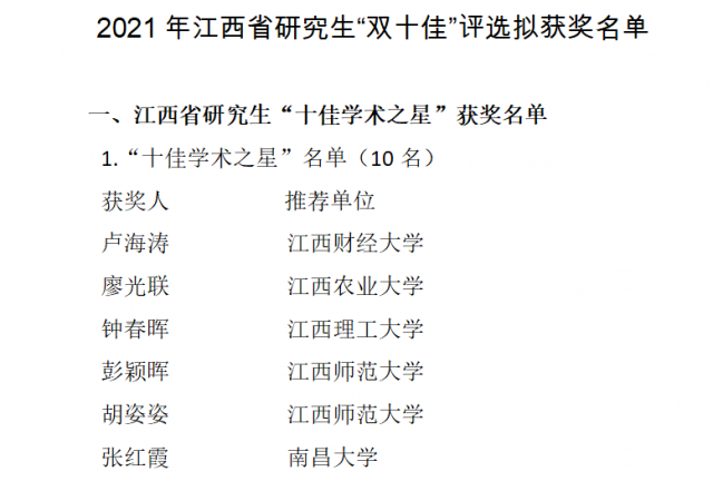 11月21日,我院19级博士研究生卢海涛以优异的成绩荣获首批江西省研究生“十佳学术之星”称号。