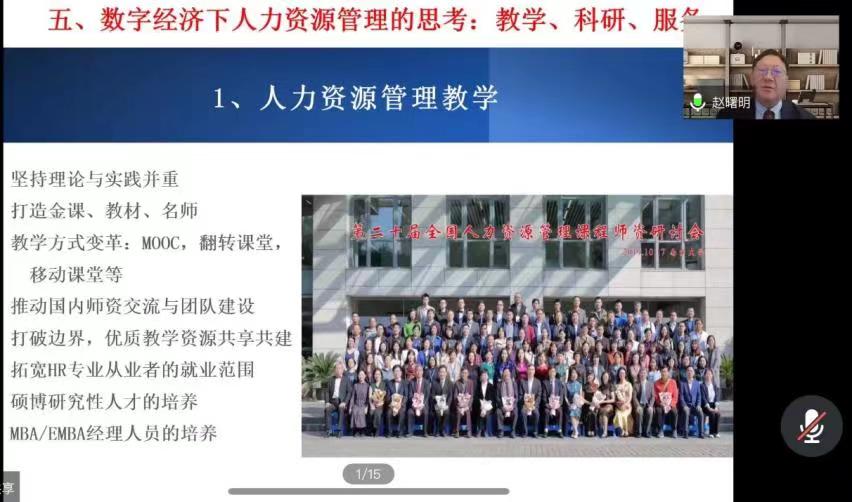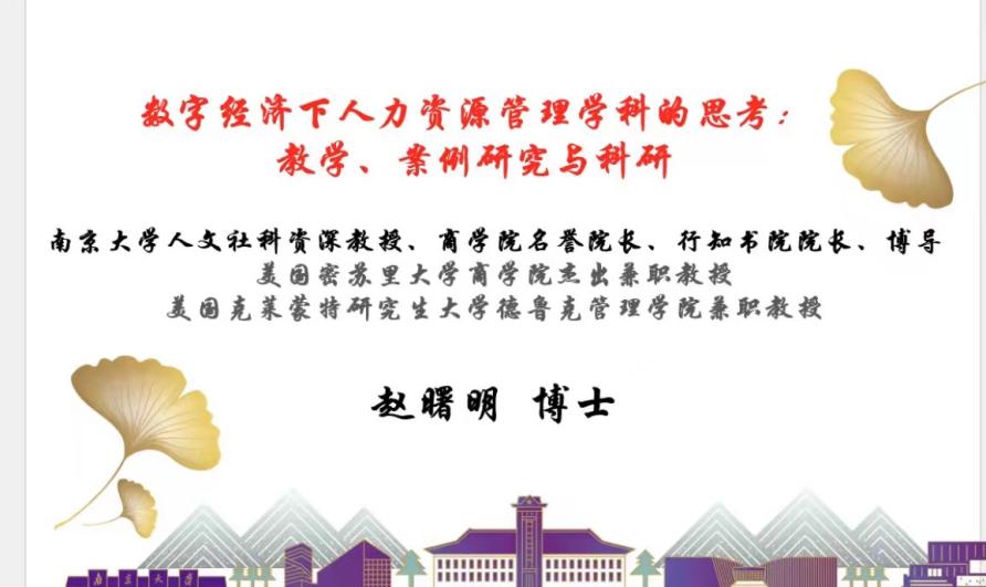 5月25下午,工商管理学院邀请南京大学人文社会科学资深教授、美国密苏里大学商学院杰出兼职教授、中国管理研究国际学会第三任主席、中国人力资源开发研究会副会长赵曙明以线上形式,作《数字经济下人力资源管理学科的思考:教学、案例研究与科研》主题讲座。讲座由工商管理学院院长胡海波教授主持,学院一百余名师生与会聆听。