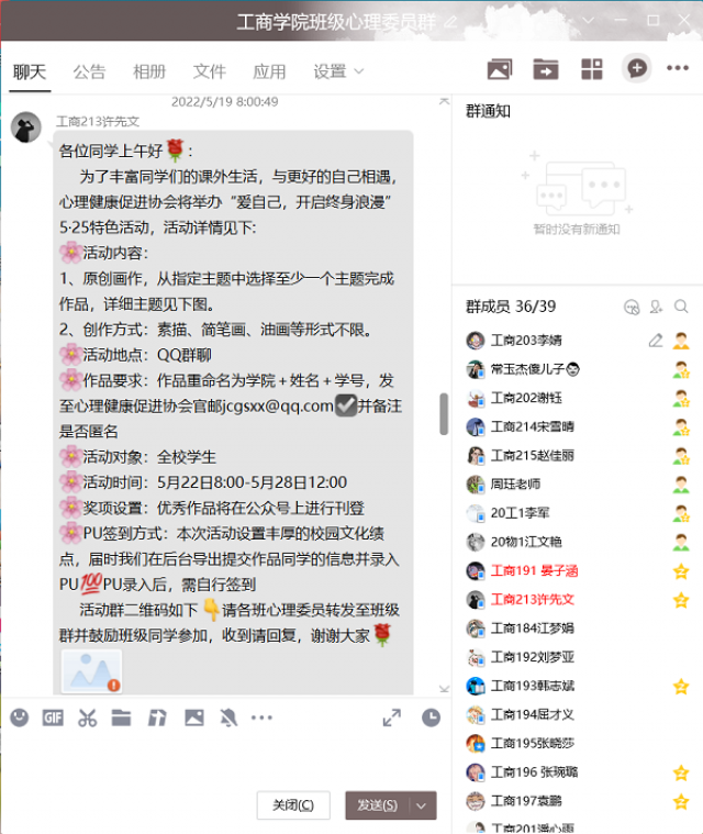 为确保活动顺利进行,让更多人了解本次活动,心理健康促进协会通过宣传说说,微信推文,创建活动QQ群等方式进行宣传,吸引各个学院同学积极参与。