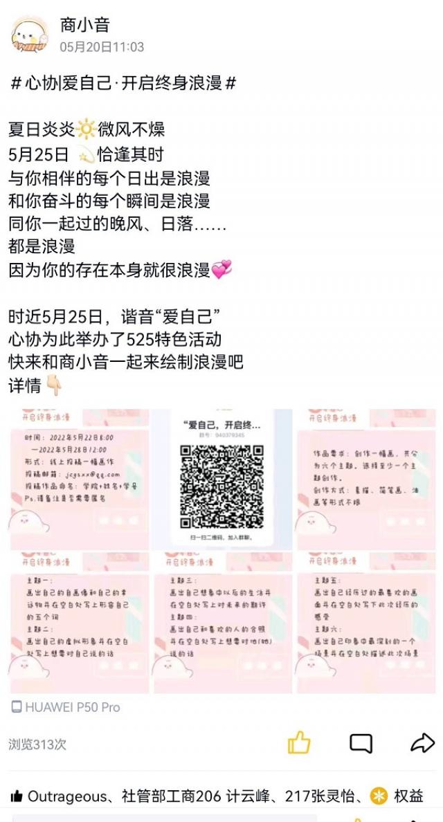 为缓解同学们在疫情期间产生的焦虑,帮助各位同学更好地调节心理状态,建立更加坚强的心理防线,工商管理学院大自委心理健康促进协会、校风督察部于5月22日-5月28日面向江西财经大学全体学生开展“爱自己,开启终身浪漫”5·25特色活动。