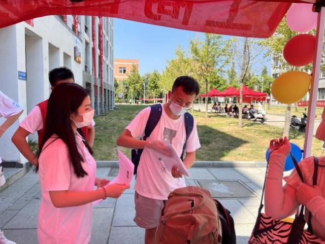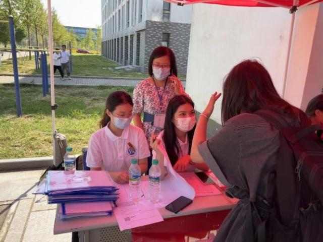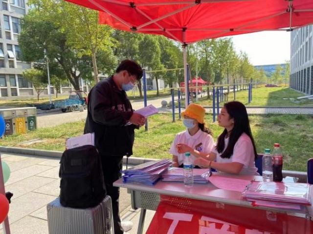 研分会及志愿者们给每个新生提供了一对一的志愿者服务,新生们到校门口后,志愿者会按照疫情防控要求核验昌通码、核酸检测证明、行程码,符合条件的同学进入校园;到达迎新点,志愿者们首先核对新生的录取通知书及个人信息,核对无误后在花名册上登记填写新生的个人资料,随后将装有校园一卡通、银行卡、新生必备手册等的文件袋以及相应尺码的院服发放给新生,最后帮新生拿上行李,带领他们熟悉的宿舍。