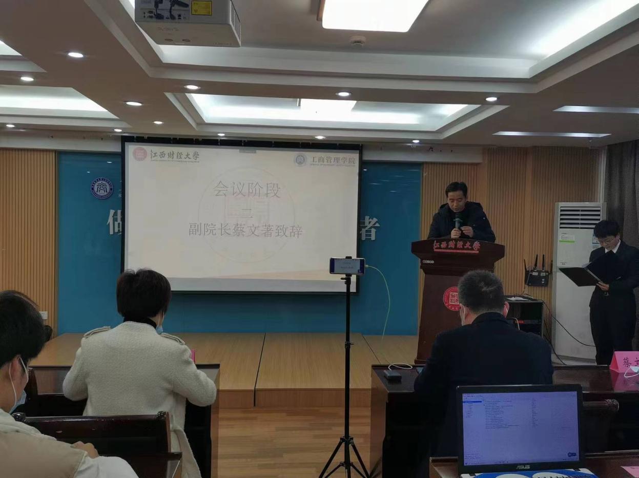 蔡文著在致辞中希望学院研分会与各兄弟单位勠力同心,以高度的责任心与主人翁意识,为培养“信敏廉毅”江财人、“知行合一”工商人躬身入局,以昂扬的姿态与风貌迎接江财百年校庆的到来。