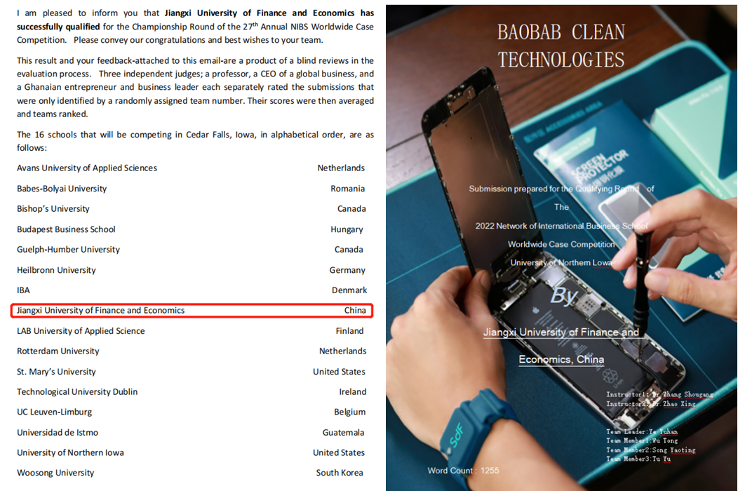 12月8日,由工商管理学院叶雨寒与、会计学院吴桐、宋耀廷与金融学院涂钰四位本科生组成的团队,在学院张守刚和赵星老师的共同指导下,从国际商学院联盟(NIBS)中来自各个国家的众多参赛队伍中脱颖而出,成功晋级第27届国际商学院联盟案例大赛十六强,并将于2023年3月参与全球总决赛,与来自美国、加拿大、德国、荷兰等国家的15支高水平队伍同台竞技。
