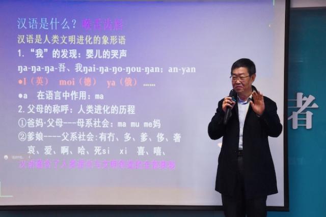 孔刃非从新闻中的错别字等身边现象切入,围绕汉语是人类文明的天籁之音、汉字是文明进化的必然结果、汉字是中华最大的IP产业三方面系统讲解,结合自身对《汉字全息学》和《汉字创造心理学》的研究,指出所有的汉字都有自己的“母亲”,要理清它们之间的客观描述性、内在规律性与字义延续性。以“方”字为例,据其“方舟”本义可以制造出“防”、“彷”、“舫”等汉字,据其“方正”引申义则可以衍生出“房”、“访”等汉字,让在座师生从多维度深切体会到汉字的独特魅力。