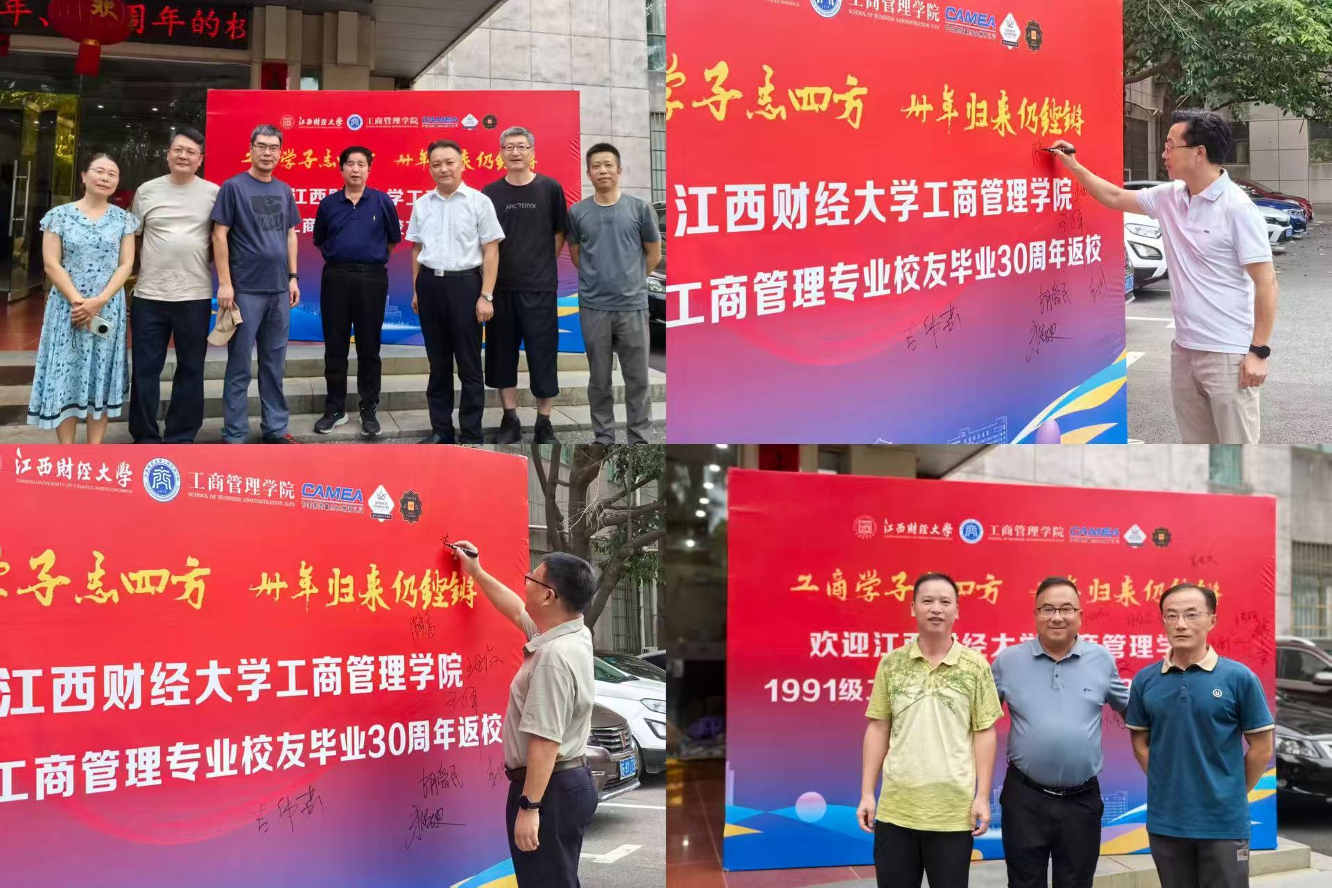 在精心布置的喷绘前,校友们纷纷停下脚步,拿起笔签下自己的名字,随后微笑着合影留念,用镜头定格这珍贵的相聚瞬间。学院还为91级工商管理专业校友贴心准备了文化衫,承载着学院的牵挂与祝福,也让校友们更深切地感受到这份跨越时光的深厚情谊。
