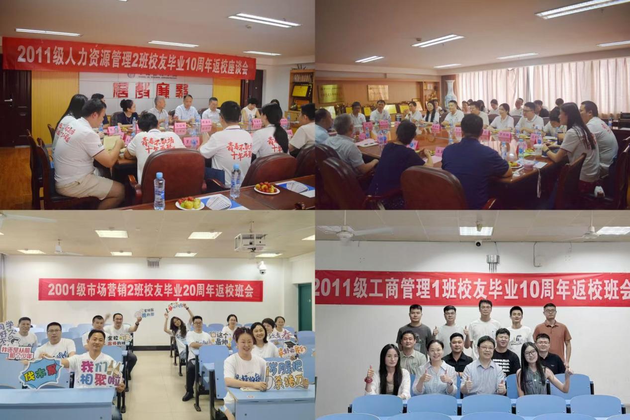此外,11级人力资源管理2班在中至大楼403会议室举行座谈会,工商管理学院院长胡海波,学院党委原书记、11级人力资源管理2班班主任熊绍辉,教师代表许丽艳、汪新艳与校友们追忆往昔,交流近况。01级市场营销2班、11级工商管理1班在江西财经大学蛟桥园举行班会。欢声笑语中,往昔的趣事、如今的生活一一被提及,温情满溢。