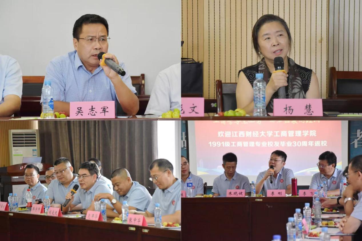 当日下午,工商管理学院1991级工商管理专业校友毕业30周年返校座谈会在麦庐园北区中至大楼416会议室举行。江西财经大学党委常委、副校长李春根,江西省教育考试院党委书记、91级工商管理专业班主任刘彪文,91级校友,景德镇陶瓷大学党委常委、纪委书记王金海,工商管理学院院长胡海波、党委书记贺三宝,91级工商管理专业班主任吴志军,教师代表杨慧等出席活动。座谈会由学院党委副书记周海燕主持。