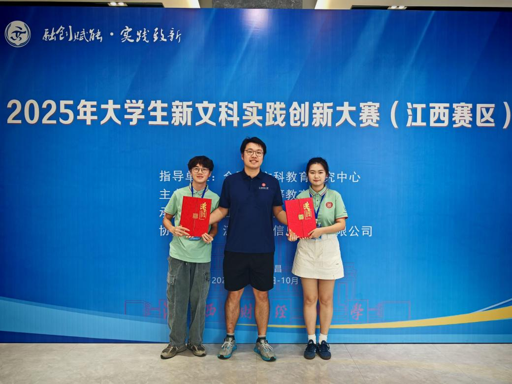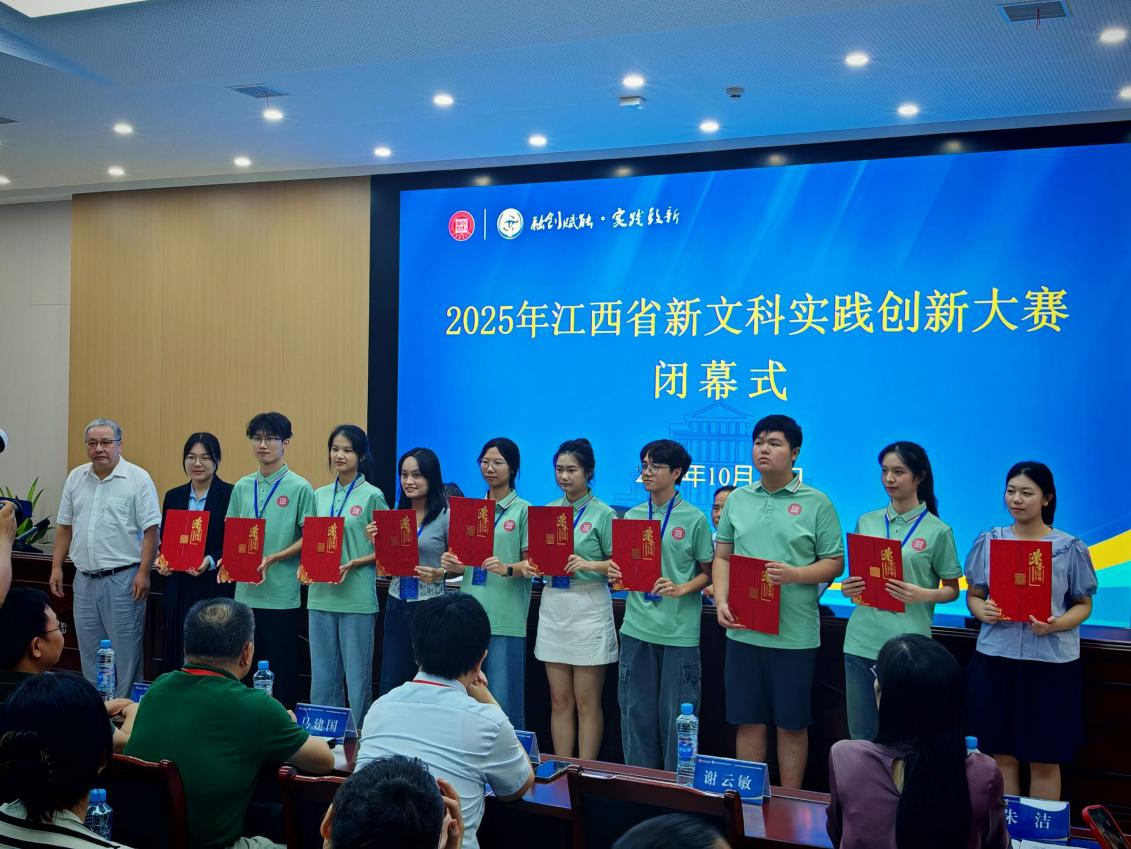 10月11日,2025年江西省大学生新文科实践创新大赛决赛圆满收官。作为深化文科实践教学改革、培育实战型人才的重要平台,本届大赛由江西省高等教育学会统筹组织,设文史哲、经管法、教育、艺术四个组别,经高校初赛选拔与省级网评赛筛选,共有162支队伍突围晋级决赛,金奖仅授予决赛18支队伍,竞争激烈。工商管理学院史文强老师指导的“使命必达小分队”(成员:陶明节、汪禹含、王敏、卢嘉城、朱世佳),凭借《跨境电商环境下本土企业出海及仓储布局协同优化研究——以湖州市吴兴区为例》项目,最终斩获金奖,系本次比赛工商管理学院获得的最高奖项。
