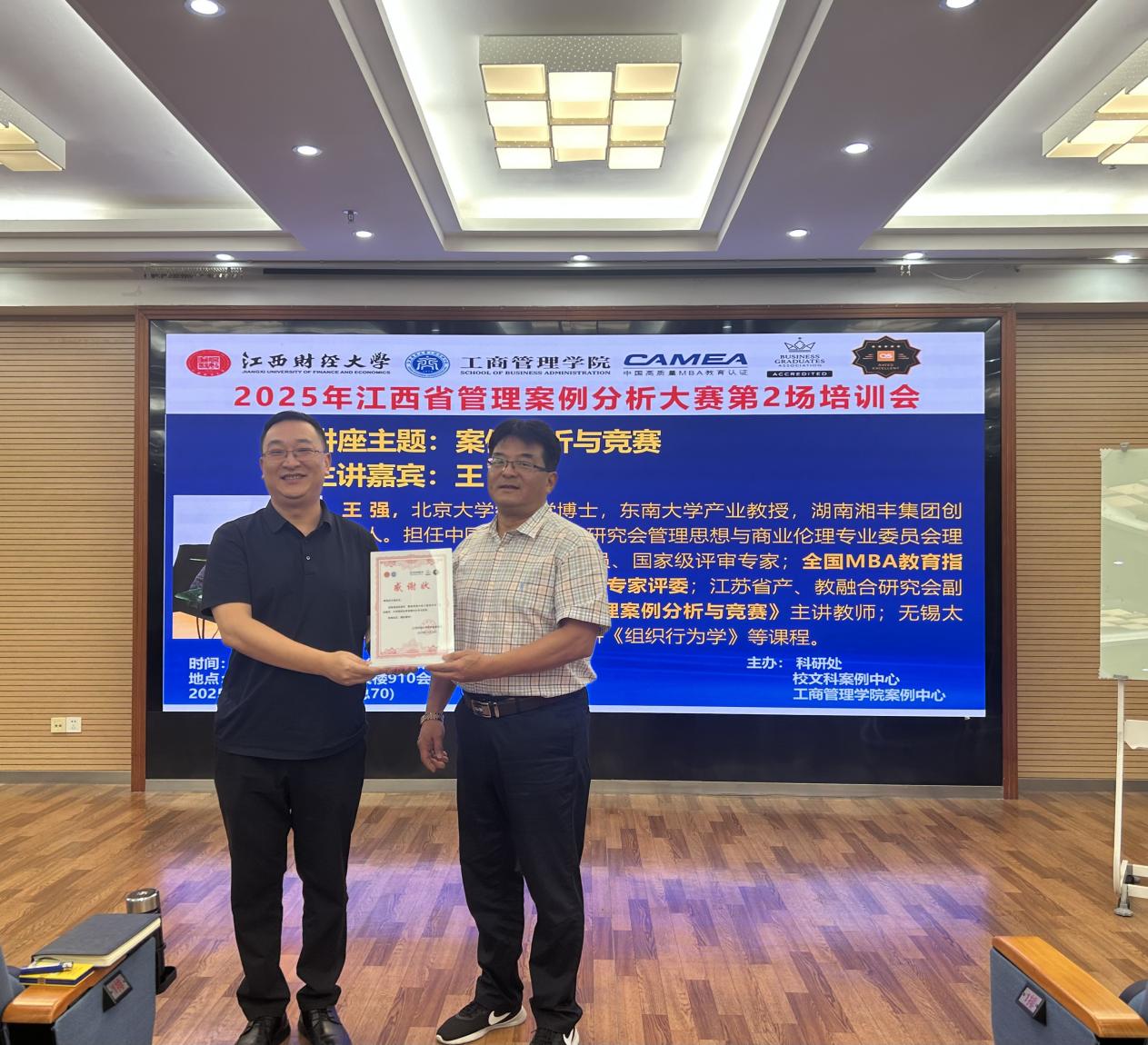 10月18日晚,2025年江西省管理案例分析大赛第二场培训会在中至大楼910会议室举行。学院特邀北京大学经济学博士、东南大学产业教授、湖南湘丰集团创始人王强担任主讲嘉宾。本次培训会由工商管理学院案例中心刘芸主持,工商管理学院副院长王鑫出席活动,并向王强教授颁发感谢状。