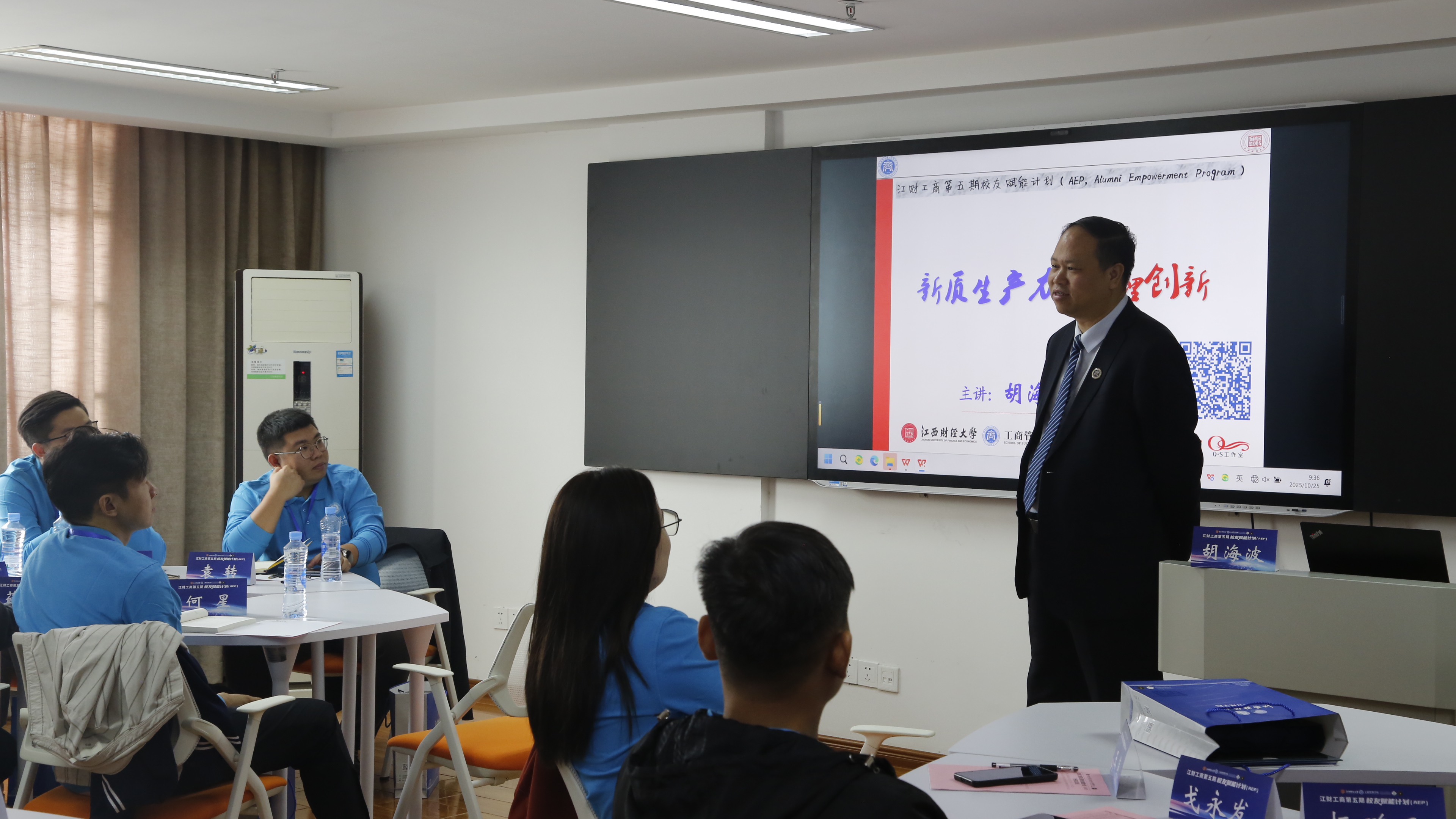 开班仪式后,胡海波以《新质生产力与管理创新》为题作专题报告。他指出随着世界迈入新时代,生产力持续演进,管理学人需敏锐捕捉问题、精准提出问题,以契合新质生产力的要求。他提出管理者必须通过有效的变革来精准识别并弥补短板,同时运用系统化、科学化的方法高效解决问题。