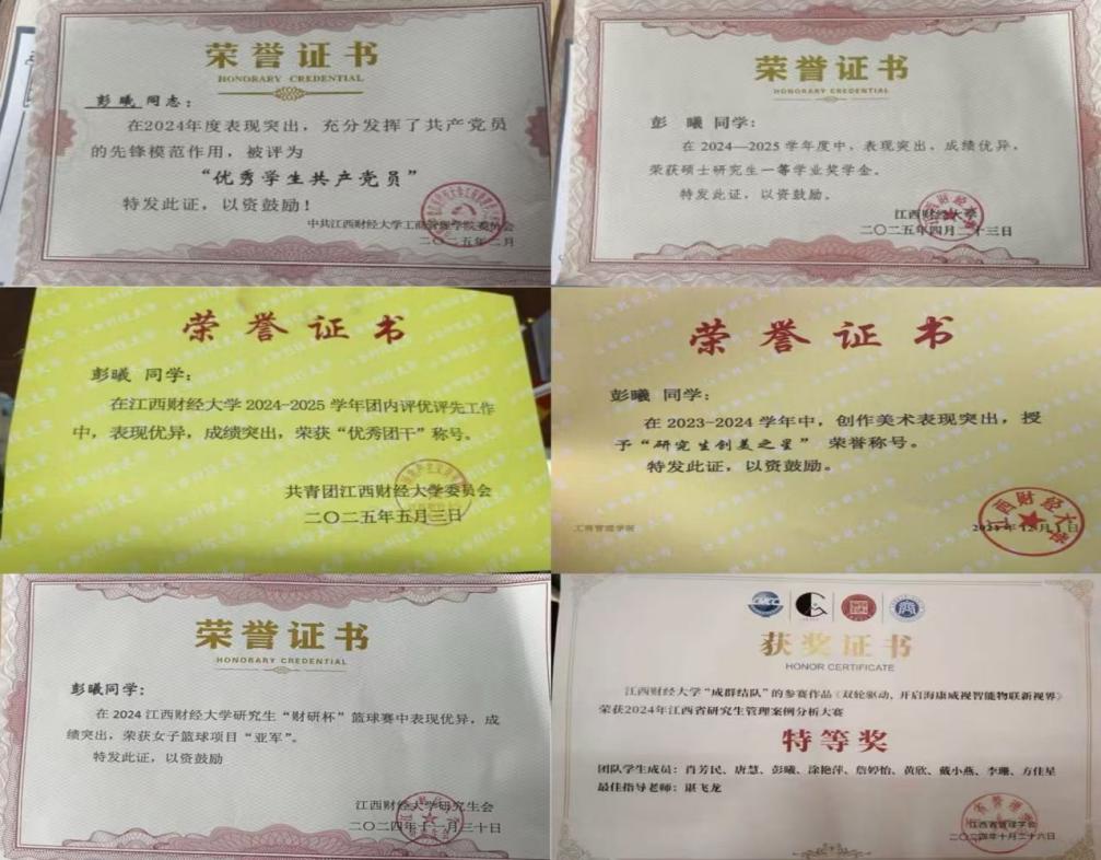 在实践与荣誉的赛道上,彭曦的收获不止于省级竞赛的亮眼成绩。体育赛场上,她随队获 2024 江西财经大学研究生 “财研杯” 篮球赛女子组亚军,展现青春活力;个人荣誉方面,先后获评“研究生创美之星”“映山红”寝室标兵、“优秀团干”及院级“优秀共产党员“”“优秀学生干部”等荣誉称号;学业上,她以扎实表现拿下校级一等奖学金,在实践、品德、学业各维度均展现出全面发展的优秀风貌。