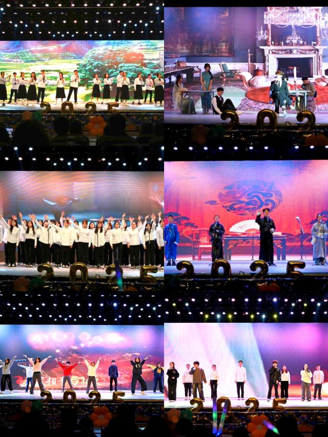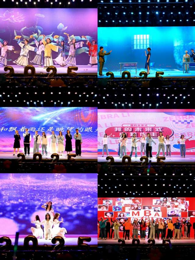 MBA256舞蹈《戏文说》以古典舞为韵,折扇为媒,开合起伏间,完美诠释古典艺术与青春风貌的交融共生。人力251话剧《风声》凭张力演绎与沉浸舞台重现经典故事中的家国赤诚,将真挚情感传至全场。声歌队《歌曲串烧》以清新旋律串联众多金曲,温柔声线搭配舒缓节奏,温馨氛围萦绕全场。工商241唱跳《我的未来式》,与台下新生隔空互动,传递“以青春奔赴未来”的信念。24企硕舞蹈《Dreams come true》,用热情姿态与整齐舞步,诠释“追逐梦想”的美好。MBA256班《明天会更好》引场下师生共同唱响,将“逐光而行”的晚会主题刻入每一段青春记忆。