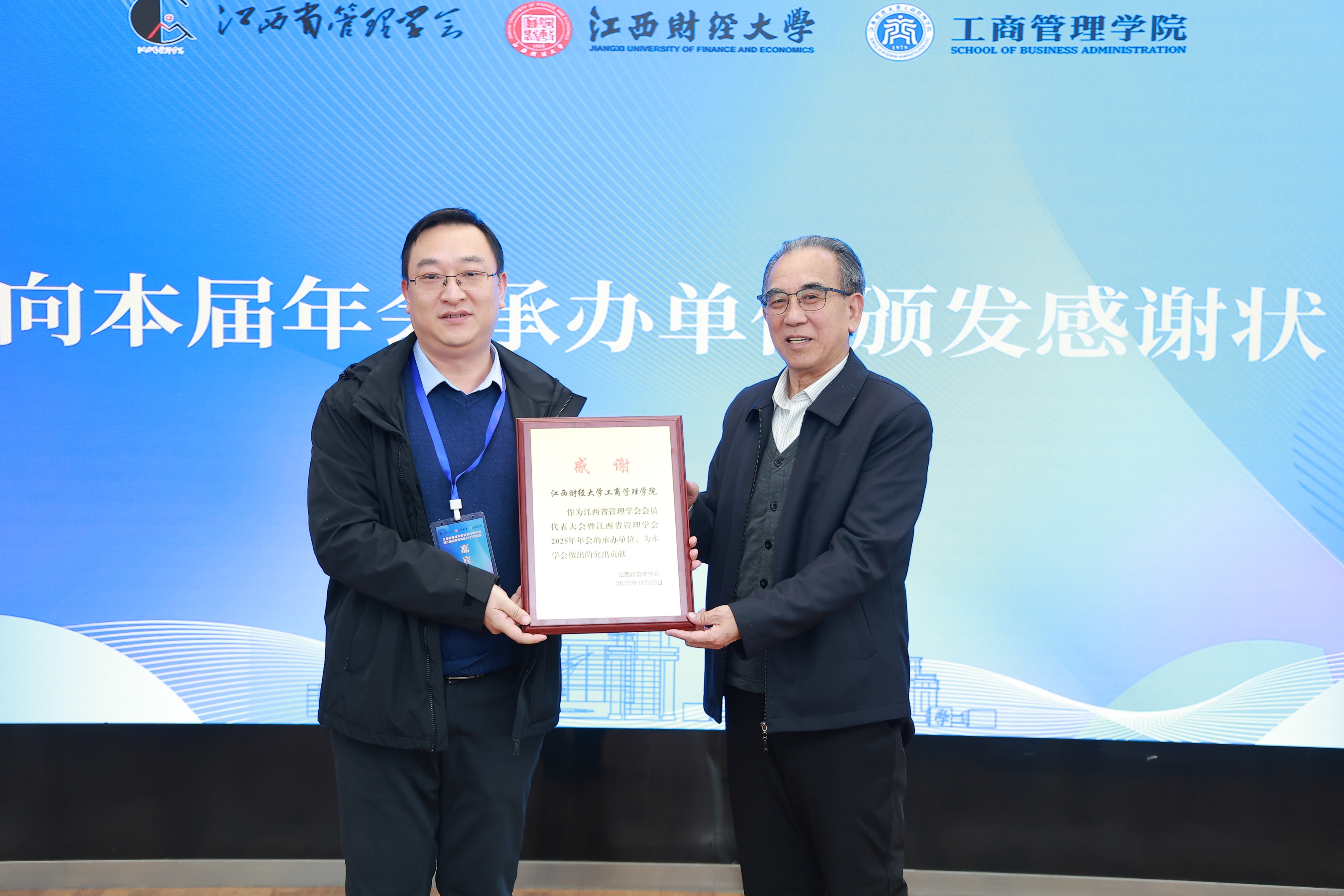 大会还为本次年会的承办单位江西财经大学工商管理学院颁发感谢状,感谢其为会议的筹备与顺利举办提供的保障和服务。