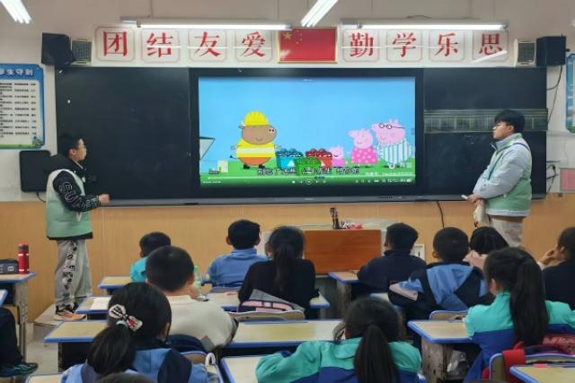 在分类知识系统讲解环节,李巳杰用通俗易懂的语言阐述垃圾从产生到处理全过程,仝熙同步组织观看垃圾分类科普视频,增强学生对话题的直观理解。二人还分别从标识识别、概念界定与生活实例三方面,详细解读可回收物、厨余垃圾、有害垃圾与其他垃圾的分类标准,讲解中穿插趣味问答、情景举例及小礼品颁发,寓教于乐,有效提升学生参与感与记忆效果。