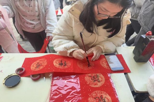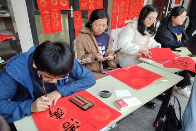除现场领取志愿者书写对联外,许多同学也被浓厚文化氛围所感染,主动执笔,静坐案前,一笔一划书写专属对联。围观同学纷纷驻足欣赏,与志愿者热切交流创作灵感、探讨对联文化,青春热忱与文化底蕴交相辉映。