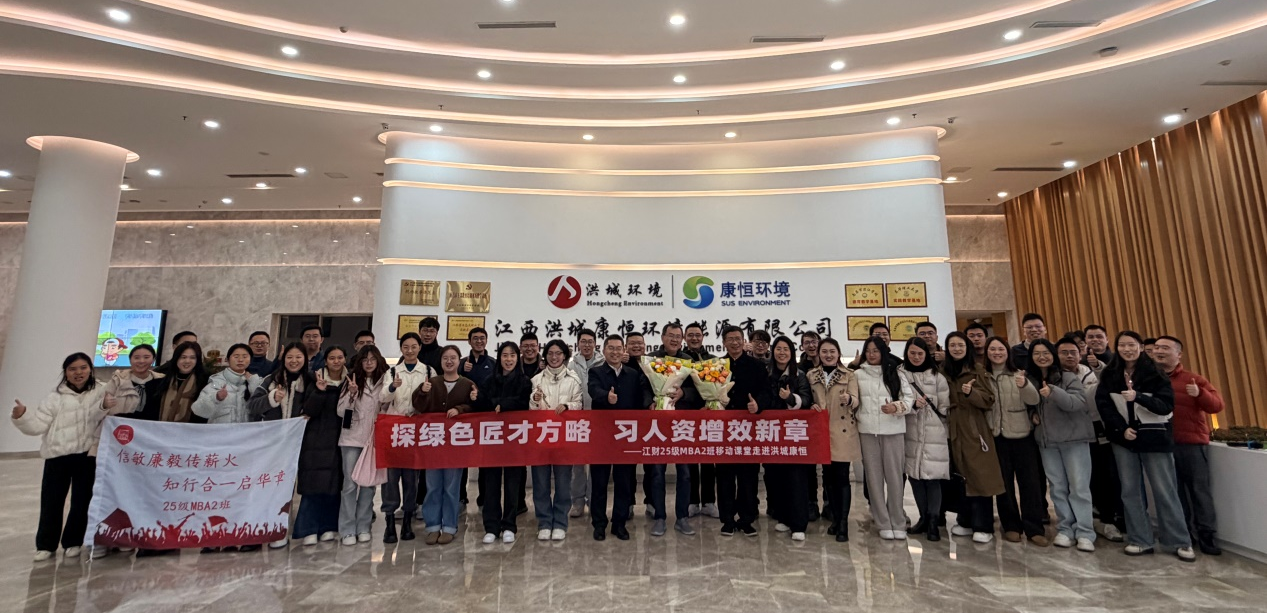 为拓展管理学实践视野,深化校企协同育人机制,探寻环境产业绿色发展与技能人才队伍建设新路径,12月21日下午,江西财经大学2025级MBA(2)班师生走进江西洪城康恒环境能源有限公司,开展《人力资源开发与管理》课程现场教学活动。本次活动由江西财经大学工商管理学院党委书记贺三宝、课程任课教师刘爱军教授、周钰老师带队,师生一行通过实地参访与专题座谈,实现高校理论教学与企业鲜活实践的深度融合。