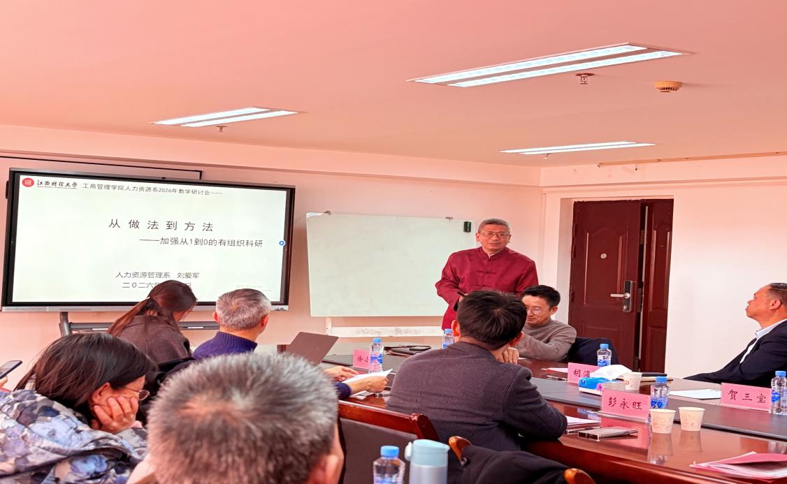 1月7日,人力资源管理系在工商大楼704会议室召开了题为“场景化教学与人才培养”的2025年度教学研讨会。工商管理学院院长胡海波,党委书记贺三宝书记,副院长朱建斌出席活动。江西财经大学评价中心副主任汤晓军、武汉大学教授杜旌、斯沃德公司人力资源中心总经理彭永旺以及人资源管理系全体教职员工参加研讨。本次研讨会由人力资源管理系主任熊立教授主持。