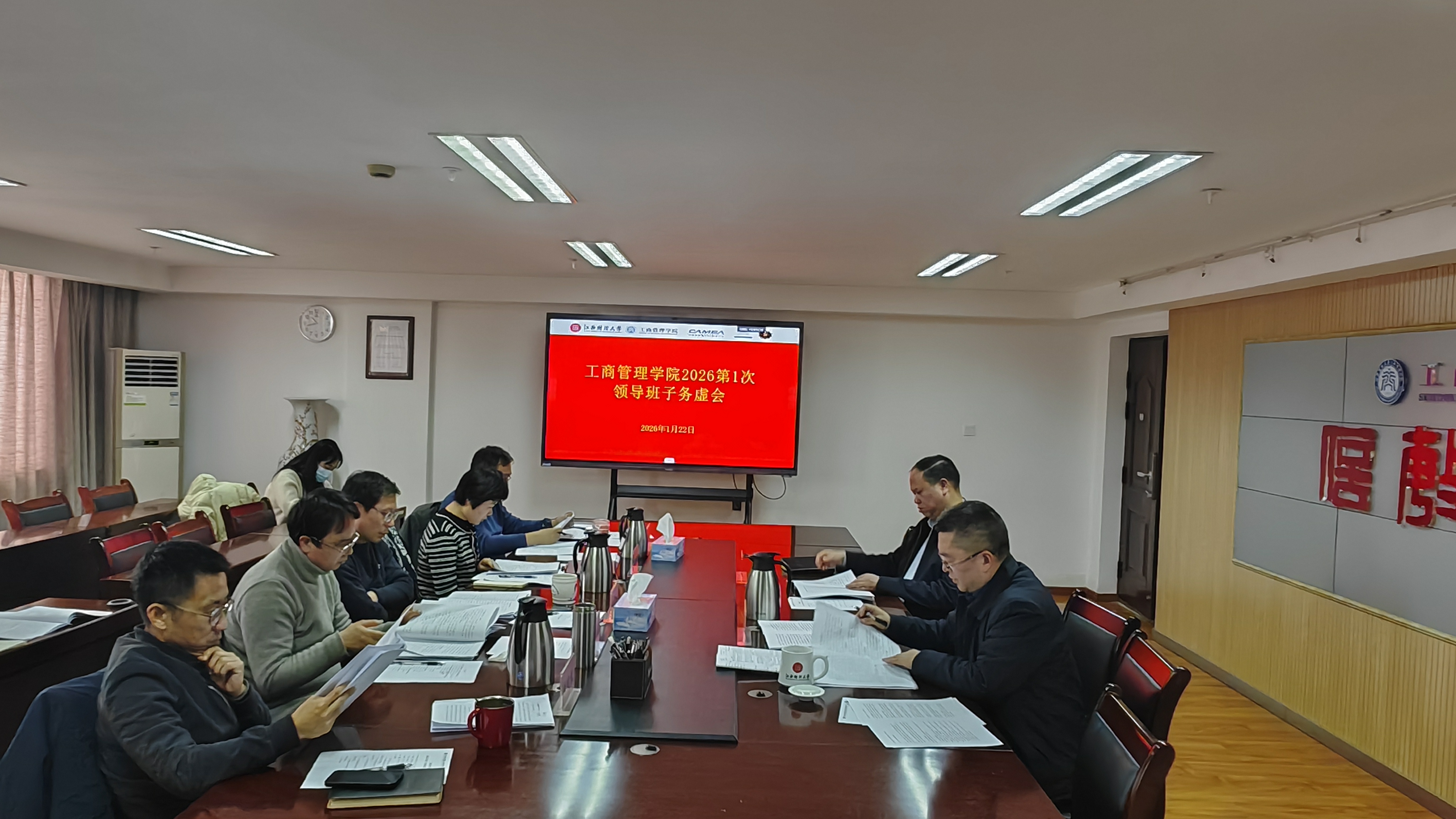 1月22日上午,工商管理学院在中至大楼503会议室召开2026年第1次领导班子务虚会,本次会议以“学院‘十五五’规划初稿论证”为核心主题,院长胡海波主持会议,贺三宝、胡海胜、周海燕、陆淳鸿、王鑫、朱建斌等院领导班子成员参会。