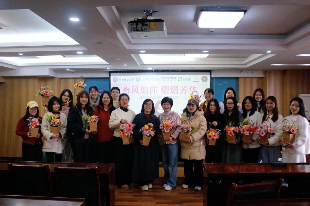 三月春风暖,芳华绽新颜。在第 116 个 “三八” 国际劳动妇女节来临之际,江西财经大学工商管理学院于 3 月 8 日在麦庐校区 416 室开展 “春风如你,熠熠芳华” 师生花艺活动。本次活动由学院 MBA 联合会主办、文体活动部承办,为全院女教师、女研究生送上专属节日祝福,让大家在馥郁花香中舒缓身心,邂逅生活诗意。