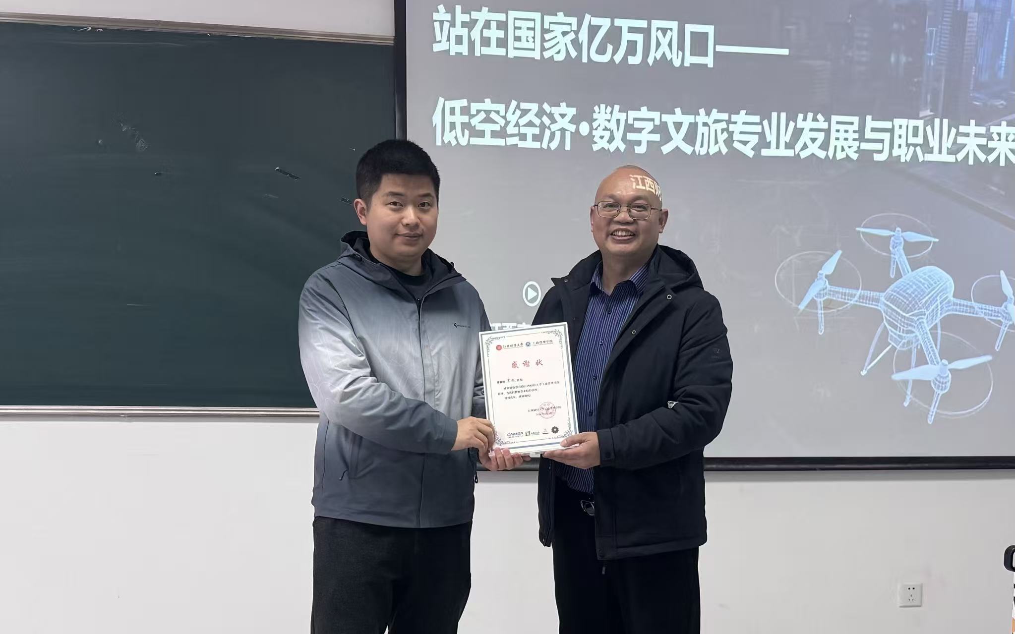 宫政也耐心地回答了学生提出的许多问题,刘德军代表工商管理学院为其颁发感谢状。本次赣鄱旅游大讲堂不仅展现了江西在智慧文旅领域的创新实践,更为青年学子指明了投身国家战略新兴产业的职业方向,彰显了产学研协同推动产业升级的示范效应。