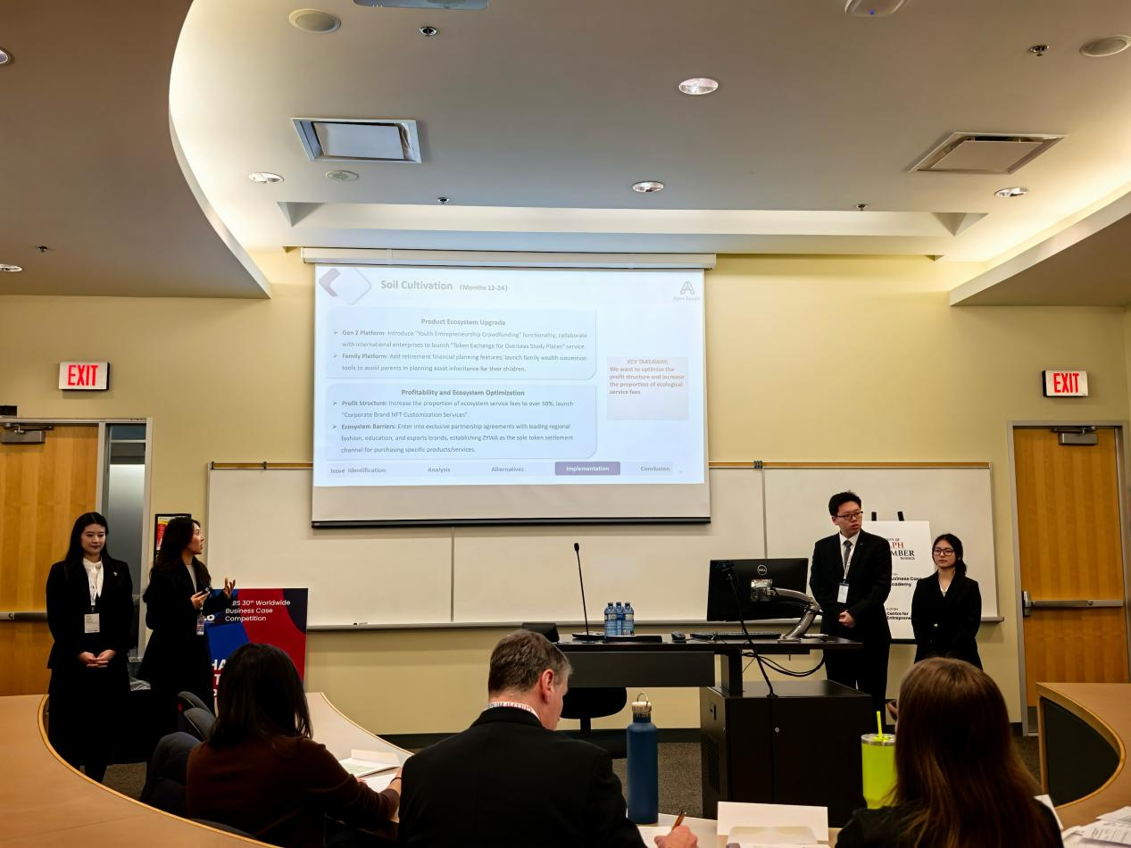 远赴多伦多后,队员们克服十五小时长途飞行、十三小时时差的考验,快速调整状态投入赛事。比赛中,江财代表队沉着应战,凭借严谨的分析框架、详实的数据支撑、贴合实际的创新方案获得评委团认可;答辩环节,队员们流利精准的英文表达、灵活果敢的临场应变,将专业知识与实战应用完美融合。历经三轮高强度限时比拼,团队以两胜一负的战绩跻身全球前列。