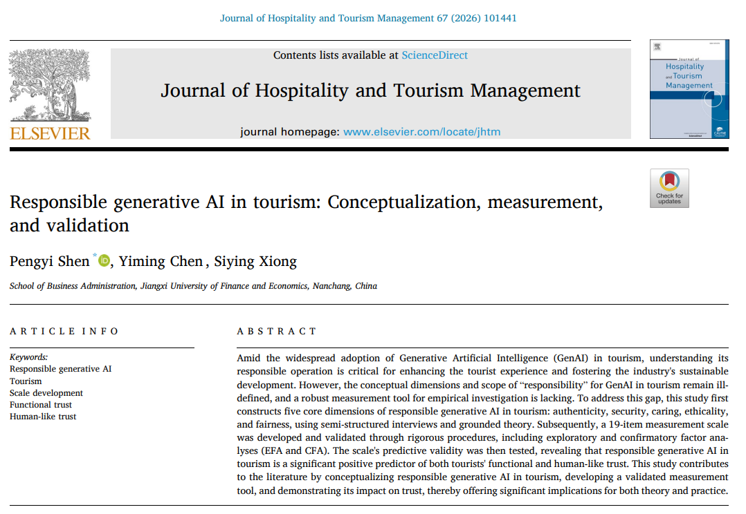 近日,江西财经大学工商管理学院2023级企业管理专业硕士生熊思颍作为第三作者,2023级博士生陈艺茗作为第二作者,其导师沈鹏熠教授作为一作的论文“Responsible generative AI in tourism: Conceptualization, measurement, and validation”在旅游管理国际权威期刊《Journal of Hospitality and Tourism Management》在线发表。