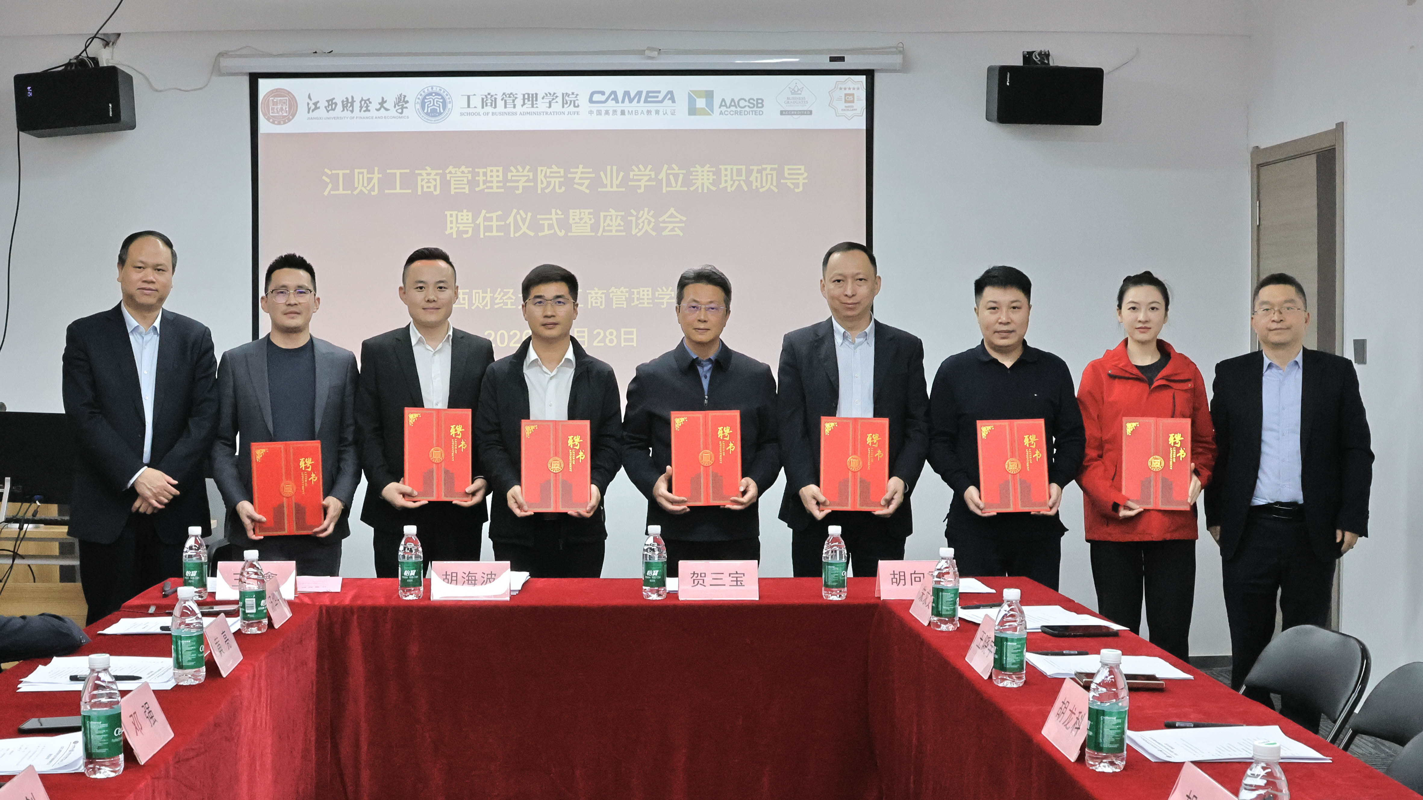 胡海波、贺三宝为新聘兼职硕导颁发聘书,胡海波与新聘兼职硕导共同宣读导师誓言。