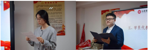 培训班班长万豪、纪律委员刘娜先后发言,并代表全体学员承诺:努力学习、严守制度,切实把学习成果转化为坚定的理想信念与自觉行动,不辜负组织的悉心培养与殷切期望。(图文/工商管理学院 肖欣 刘竞辉 胡慧欣 刘丽欣 章逸飞)