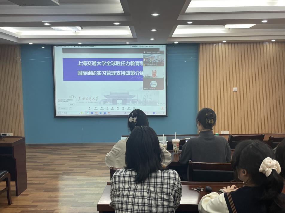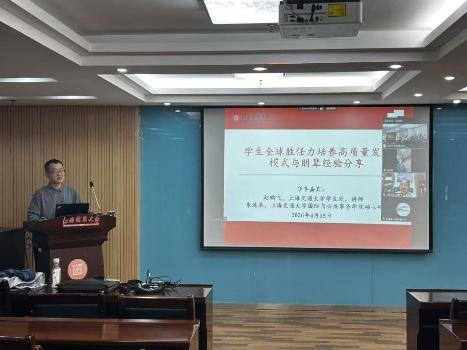 为助力培养兼具家国情怀、全球视野与国际竞争力的高素质国际化人才,服务教育对外开放与人类命运共同体建设,4月15日,以“学生全球胜任力培养高质量发展模式与朋辈经验分享”为主题的专题讲座在工商管理学院中至大楼516举办。本次讲座邀请了上海交通大学学生处赵鹏飞老师和上海交通大学国际与公共事务学院硕士研究生朱逸辰同学做主题分享,我校国际组织后备人才训练营班老师段瑞焜老师和各学院师生代表到场参加。